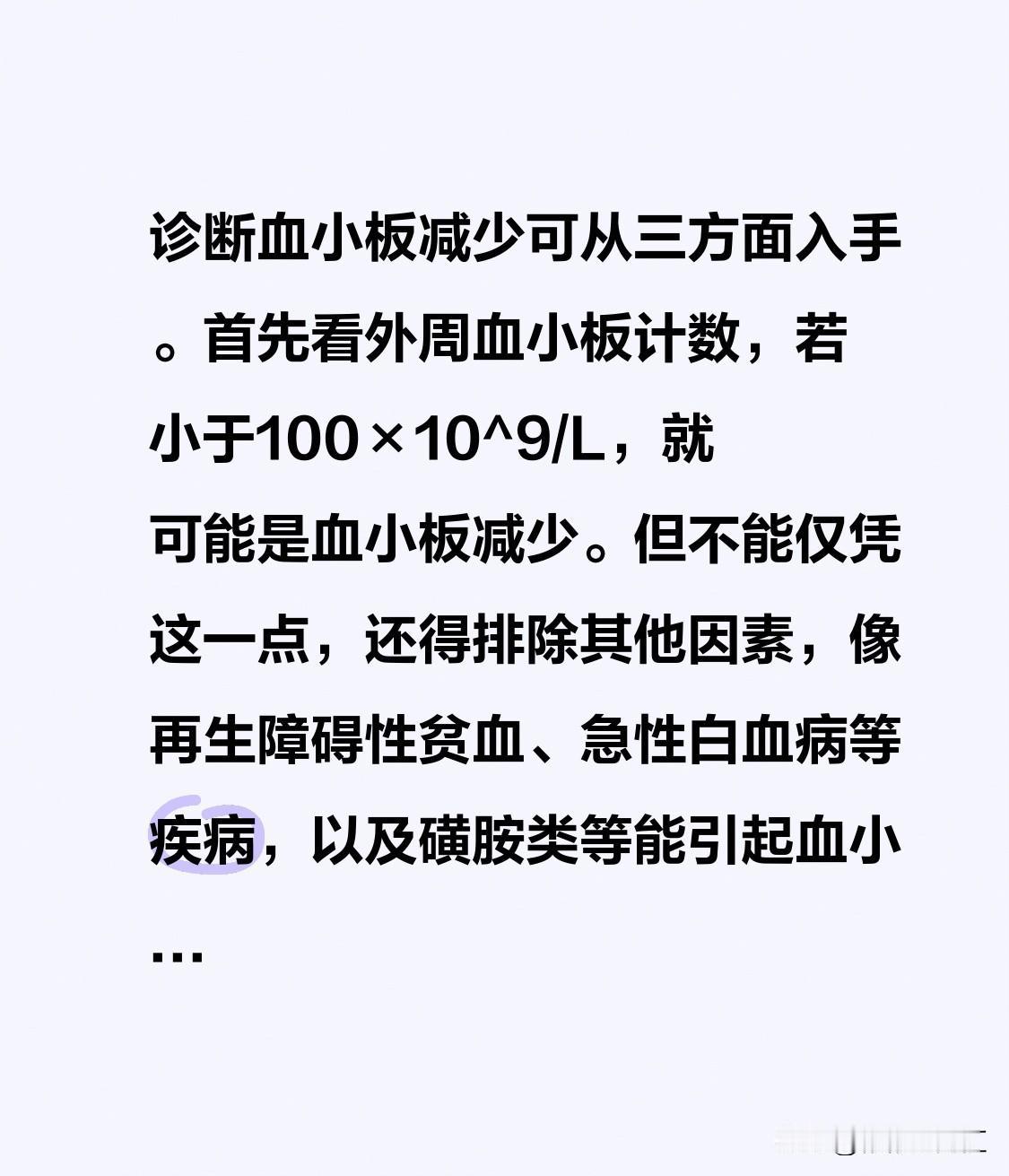 诊断血小板减少可从三方面入手。首先看外周血小板计数,若小于100×10^9/L,