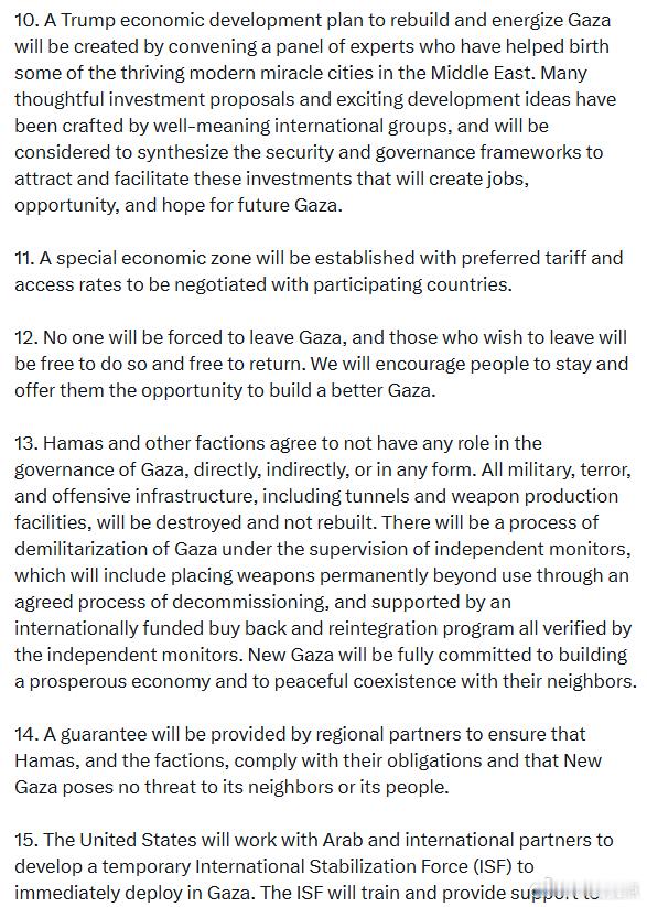 10. 将成立“特朗普经济发展计划”,由曾经帮助中东一些现代奇迹城市崛起的专家组成专家小组,重建和振兴加沙。许多国际团体已提出深思熟虑的投资建议和令人振奋的发展构想,这些将被纳入考量,与安全和治理框架相结合,以吸引和促进投资,创造就业、机会与希望。