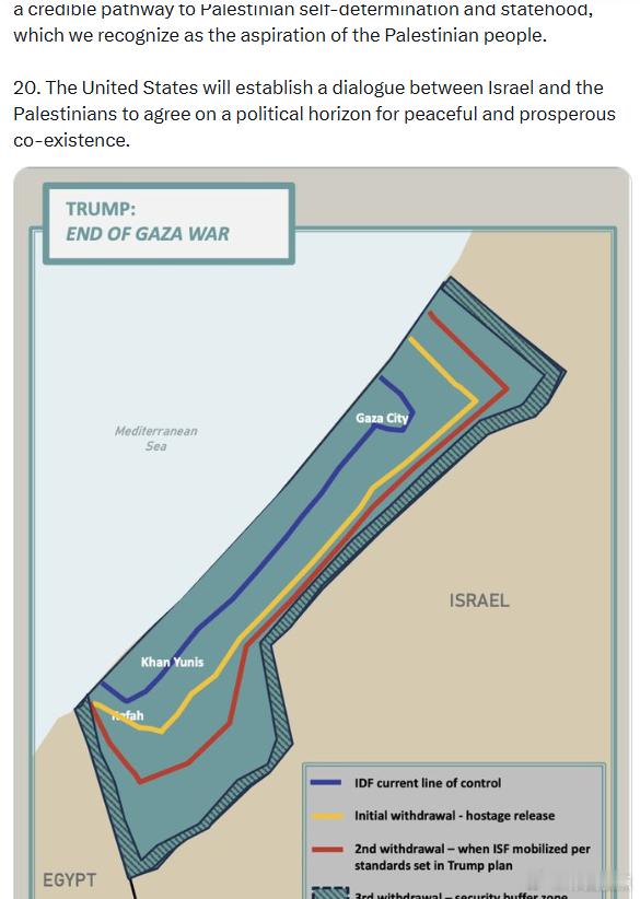 16. 以色列不会占领或吞并加沙。随着ISF建立控制与稳定,以色列国防军(IDF)将根据与IDF、ISF、担保方及美国达成的标准、里程碑与时间表逐步撤离,其目标是一个安全的加沙,不再对以色列、埃及或其公民构成威胁。实际上,IDF将根据与过渡当局的协议,逐步将其占领的加沙地区移交给ISF,直至完全撤出,仅保留一个安全警戒区,直到加沙完全摆脱恐怖威胁为止。