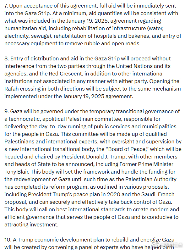 9. 加沙将由一个临时过渡性的、技术官僚组成的巴勒斯坦委员会治理,负责为加沙人民提供日常公共服务和市政管理。该委员会由合格的巴勒斯坦人和国际专家组成,由新的国际过渡机构“和平委员会”监督管理。该委员会将由特朗普总统担任主席,其他成员和国家元首将随后公布,包括前英国首相托尼·布莱尔。该机构将设定加沙重建的框架与资金机制,直到巴勒斯坦民族权力机构完成改革方案(包括2020年特朗普总统和平计划与沙法方案中提出的改革),并能有效接管加沙治理为止。该机构将借鉴国际最佳标准,创建高效现代的治理体系,服务加沙人民,并吸引投资。