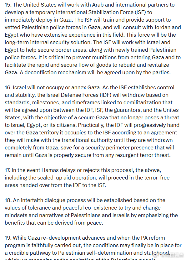 15. 美国将与阿拉伯及国际伙伴合作,组建临时“国际稳定部队”(ISF),立即部署到加沙。ISF将训练并支持经审核的巴勒斯坦警察部队,并与在该领域经验丰富的约旦和埃及进行磋商。该部队将成为长期的内部安全解决方案。ISF将与以色列和埃及合作,协助加沙边境地区安全工作,同时与新训练的巴勒斯坦警察部队协同。防止武器流入加沙并确保物资快速、安全进入以便重建至关重要。双方将商定冲突降级机制。