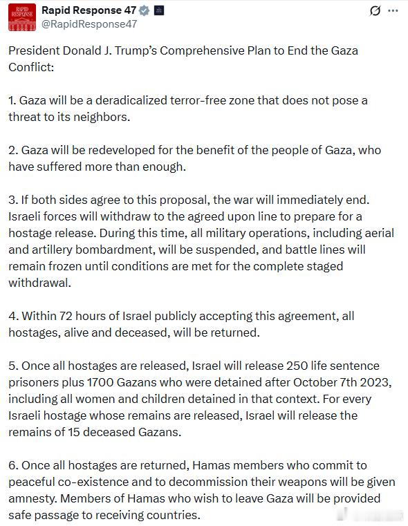 唐纳德·特朗普总统结束加沙冲突的全面计划:1.加沙将被去极端化,成为无恐怖主义