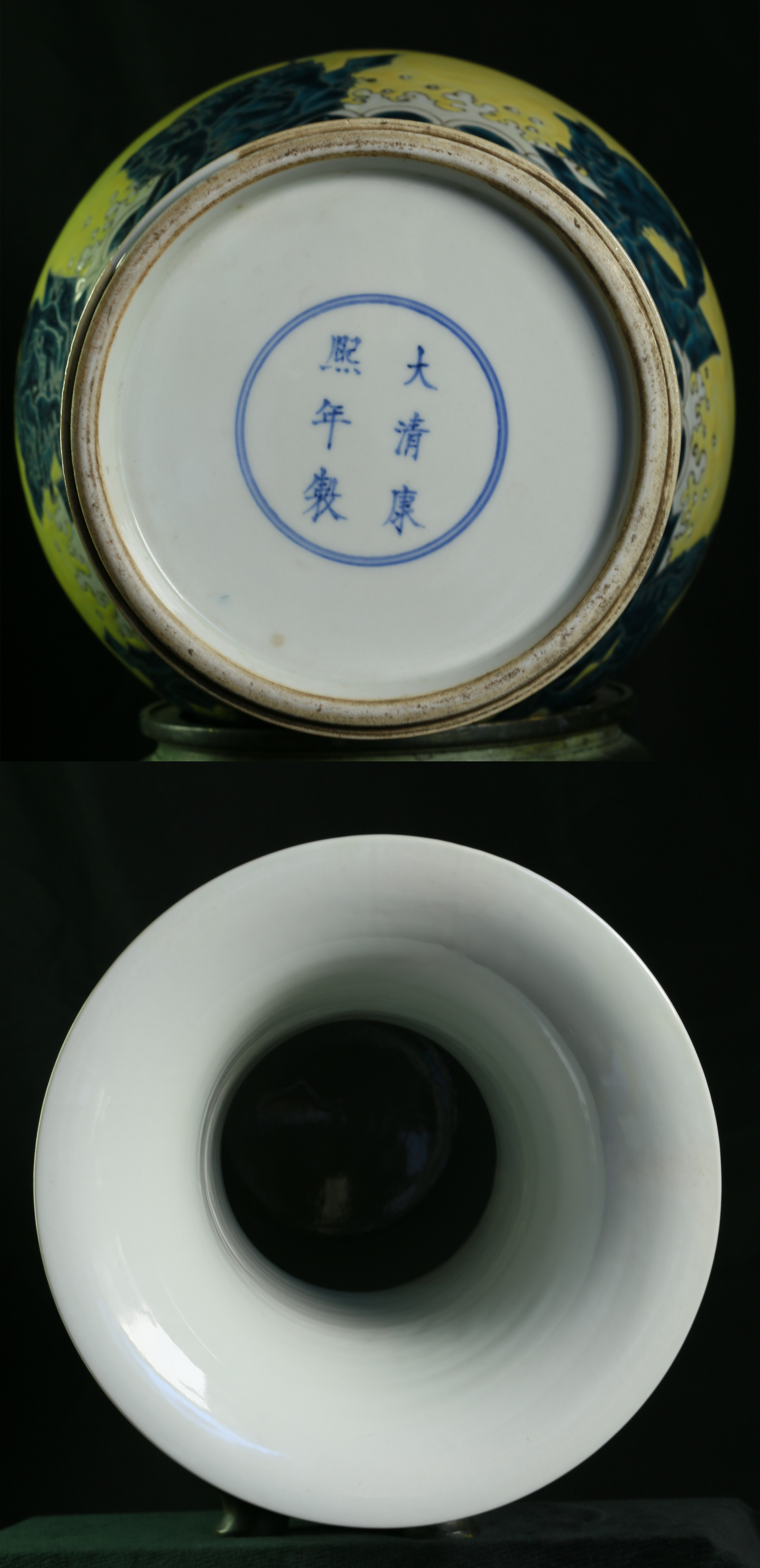 包老,此尊是一件康熙朝本朝真古瓷真品。开门到代,老化、古旧、古韵老气十足。我们从底、从内膛、从老胎、从胎底,从底足切削二层台,从青花钴料款字看、从天然矿彩上看、从彩的老化看、从画工上看,从艺术风格上看、从纹饰上看,无论从任何方面看,此凤尾尊都是一件清代康熙朝的老窑古瓷,是件非常开门的清康熙黄地素三彩海兽纹凤尾尊。是件开门到代的清代古瓷真品。