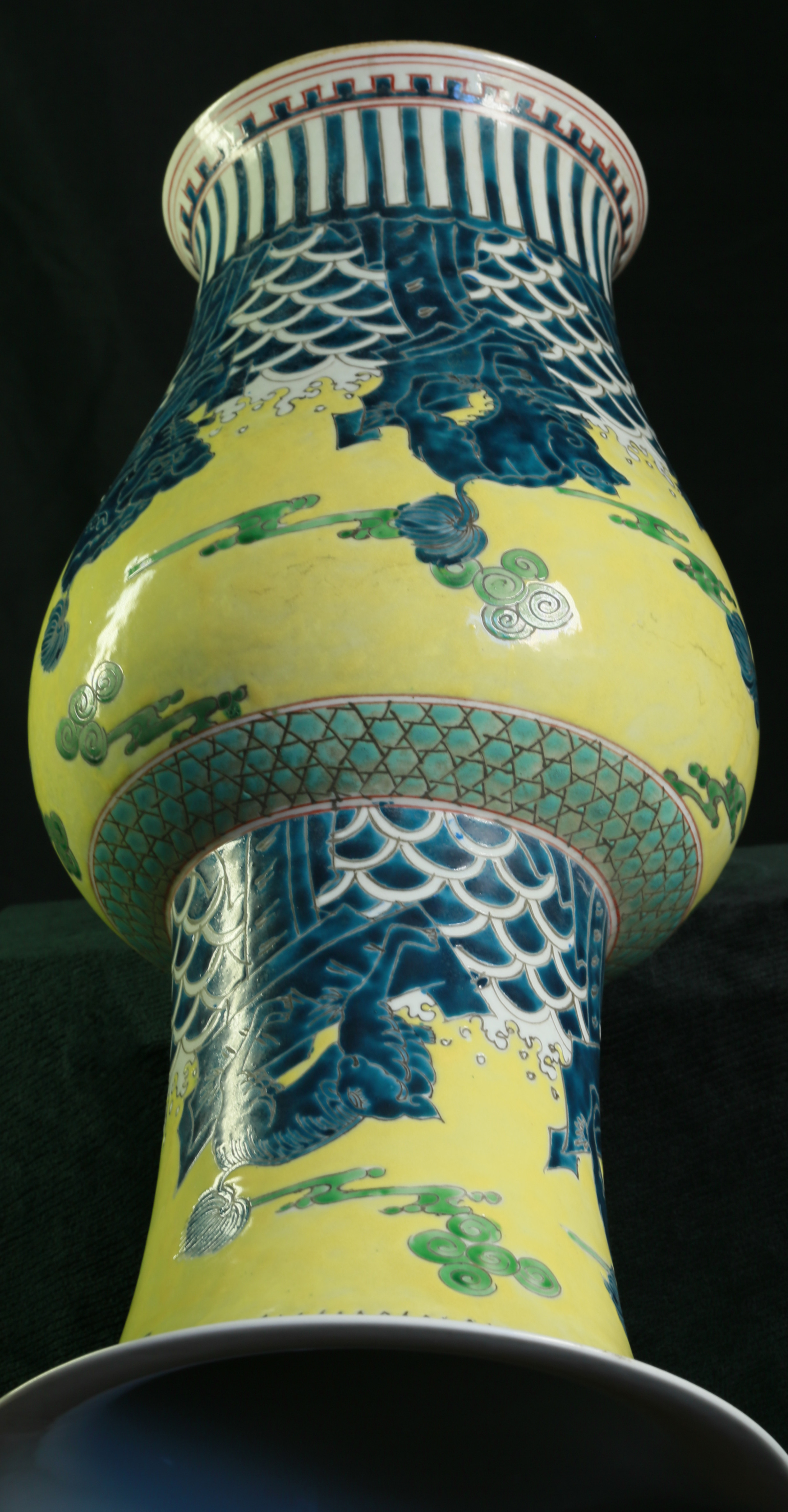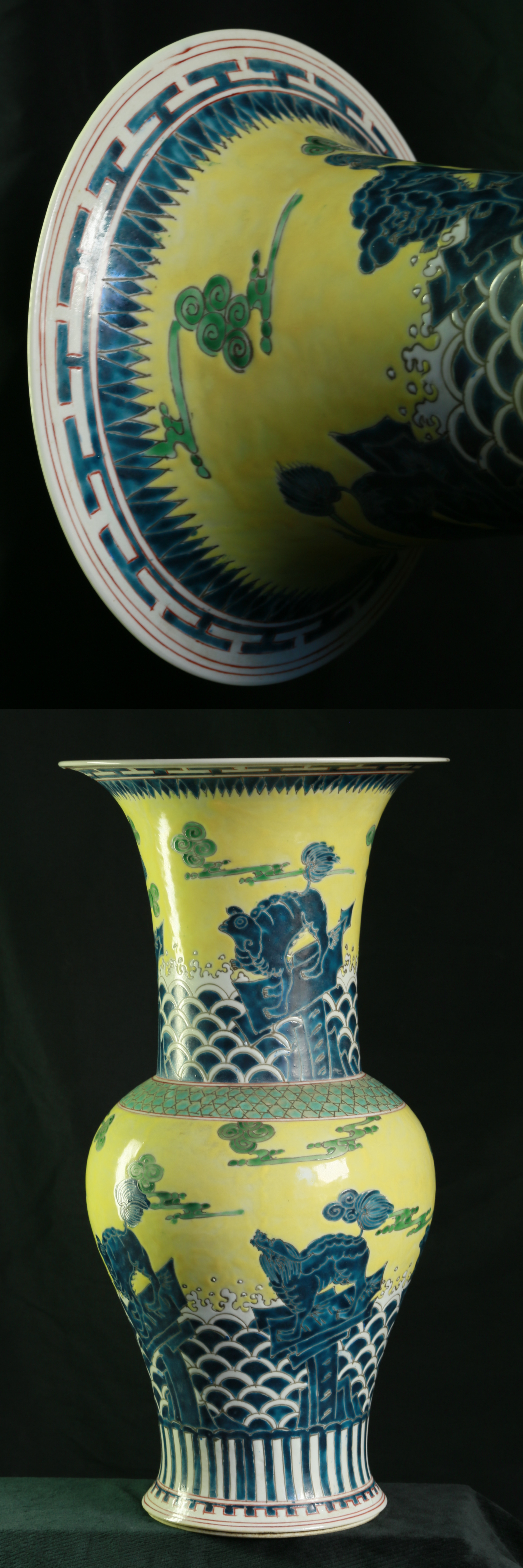 清康熙 . 黄地素三彩海兽纹凤尾尊一件