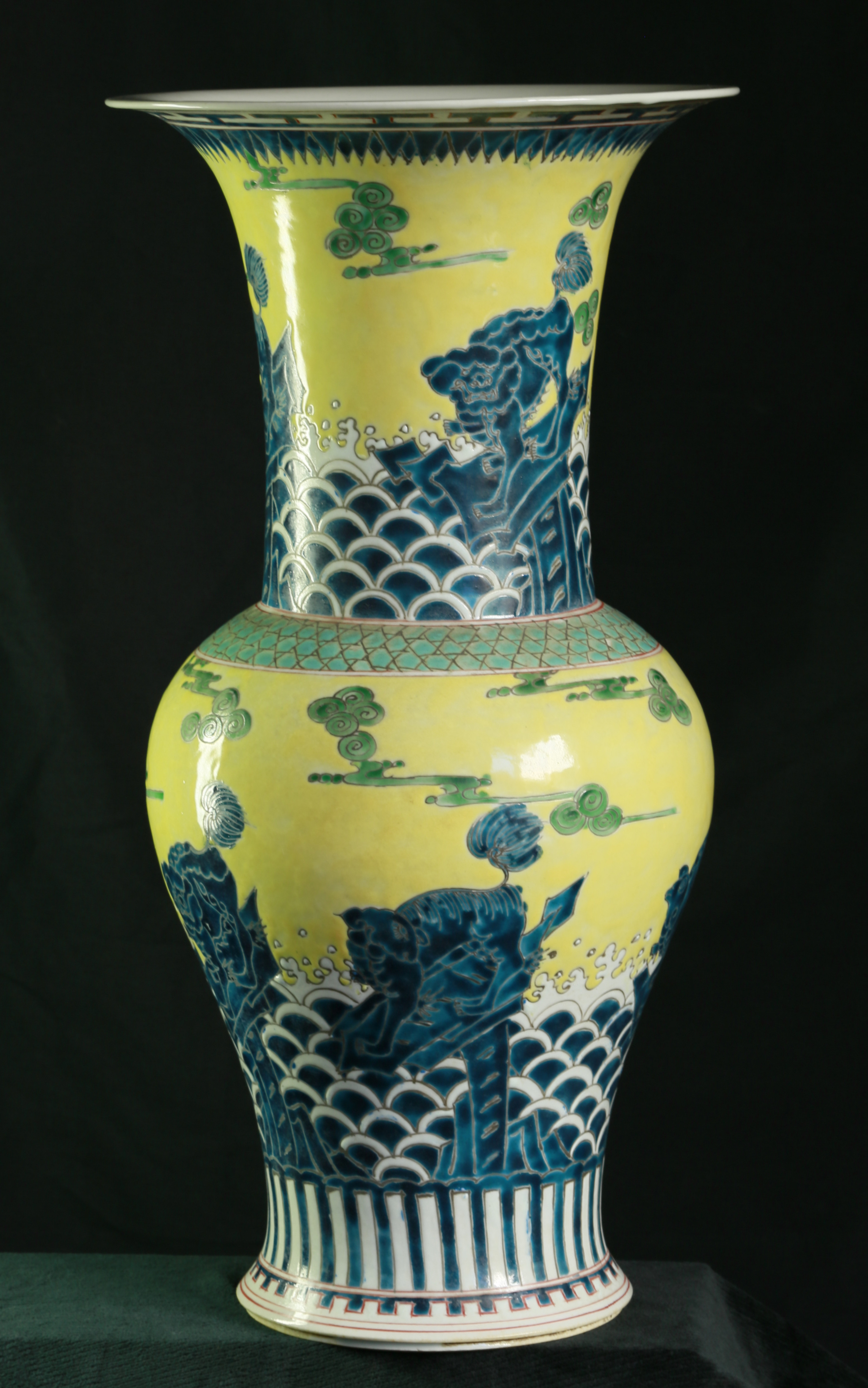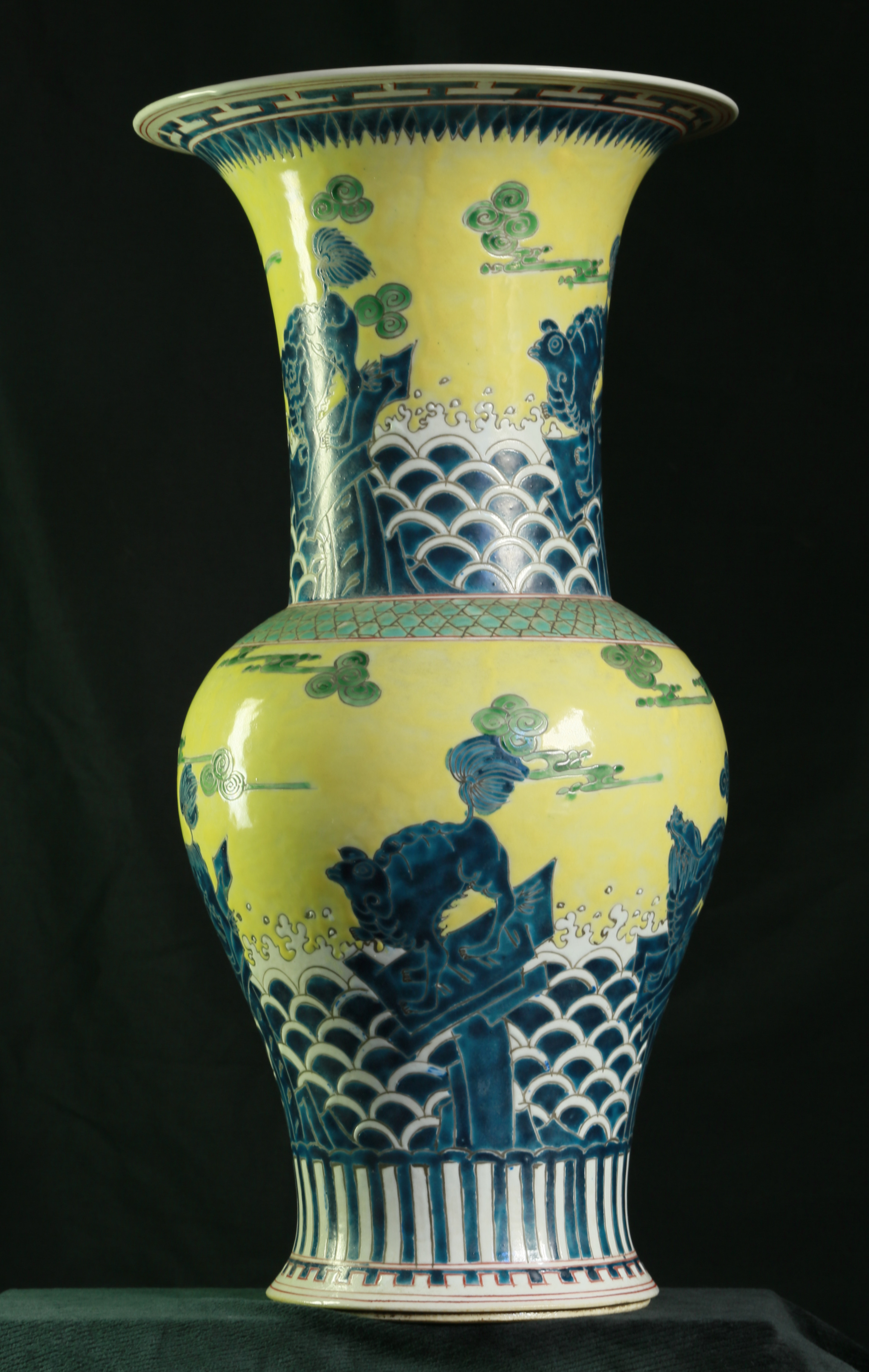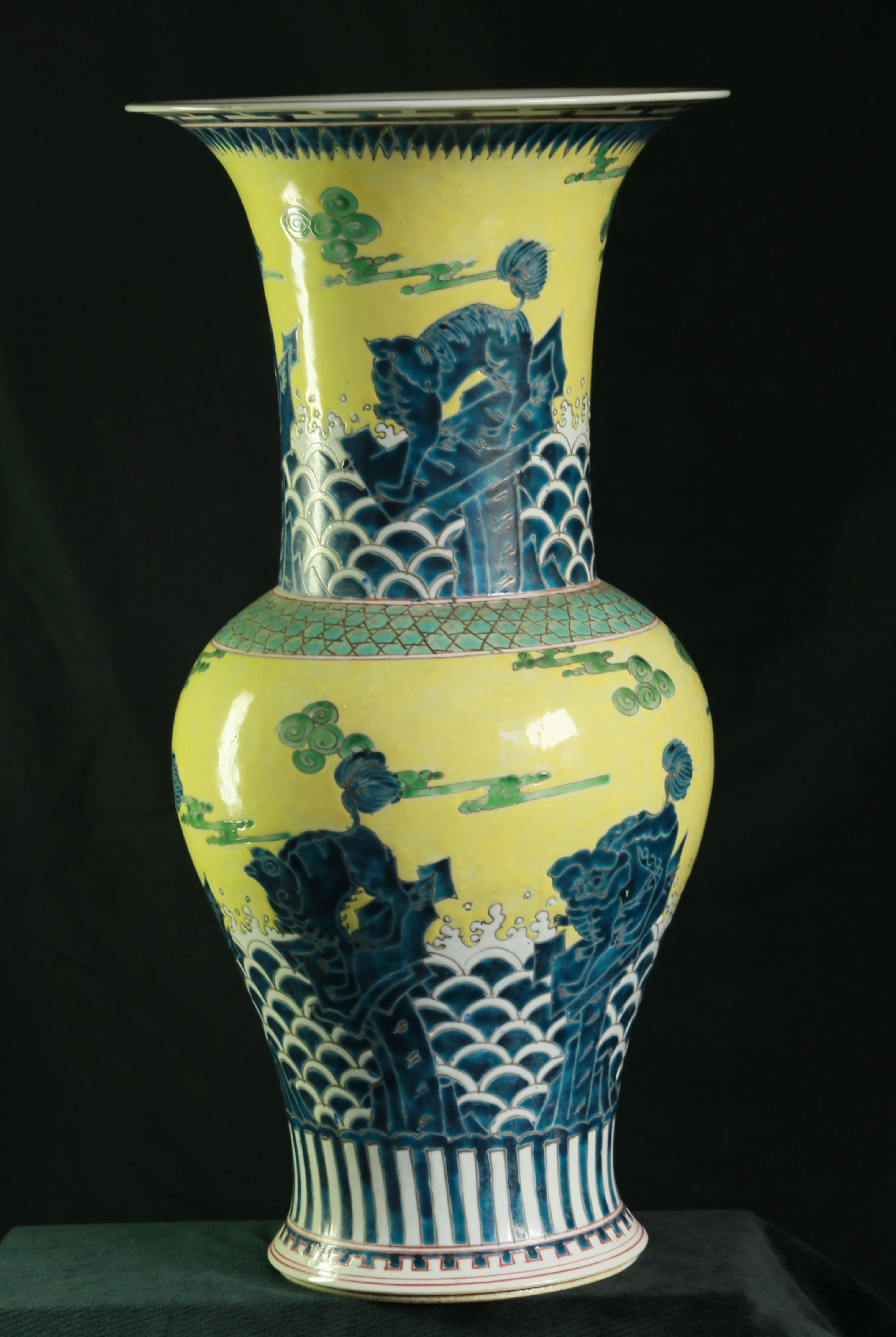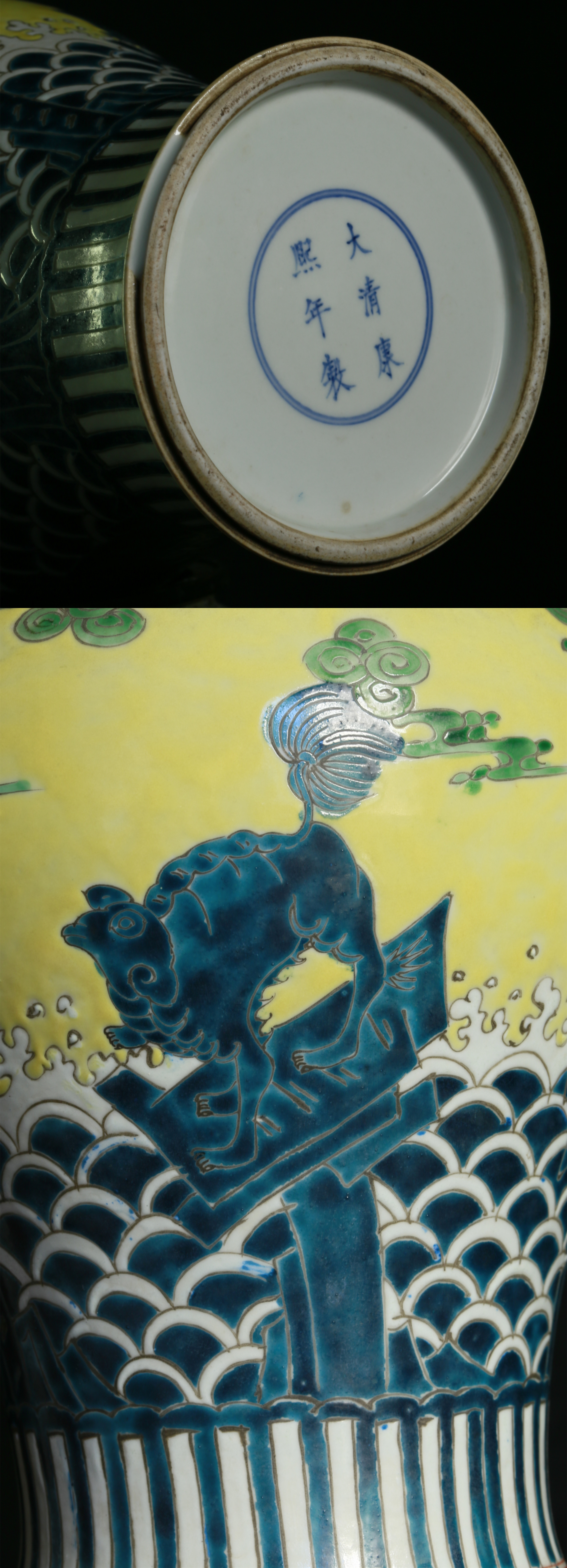 敞口外撇,长颈,丰肩,鼓腹,圈足外撇、底足切削二层台,俗称“凤尾尊”。造型挺拔俊秀,线条流畅。胎质细腻。三彩发色艳丽,画工精美,图案错落有致。是康熙时期典型器,堪称精品。本尊釉面润泽,色调鲜明,纹饰层次清晰。本尊器形硕大挺拨,通体黄色釉为底,以素三彩绘海兽纹、山海纹、海浪纹,色彩鲜艳合谐,构图自然疏朗,画工精致自然而洒脱,整体气息富丽华贵夺人眼目。素三彩是瓷器釉上彩品种之一,是以黄、绿、紫、蓝三色为主的瓷器,其实并不仅限于此三色,但不用红色。其制作方法是,在高温烧成的素瓷胎上,用彩釉填在已刻划好的纹样上,再经低温烧成。本品需经二次烧制而成,烧制成本高,且费工费时,因色彩中没有红彩,故名“素三彩”。本尊底有青花楷书“大清康熙年制”款,此器为康熙本朝器物。