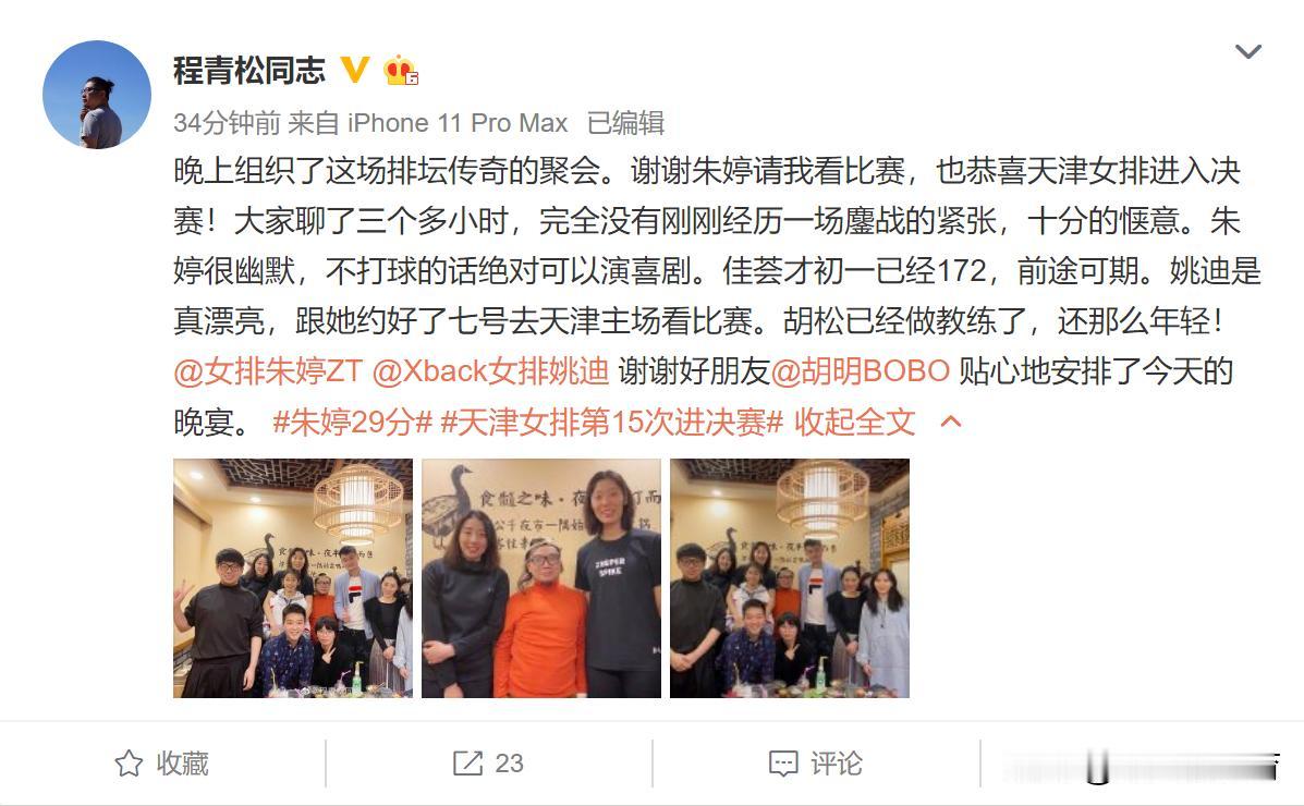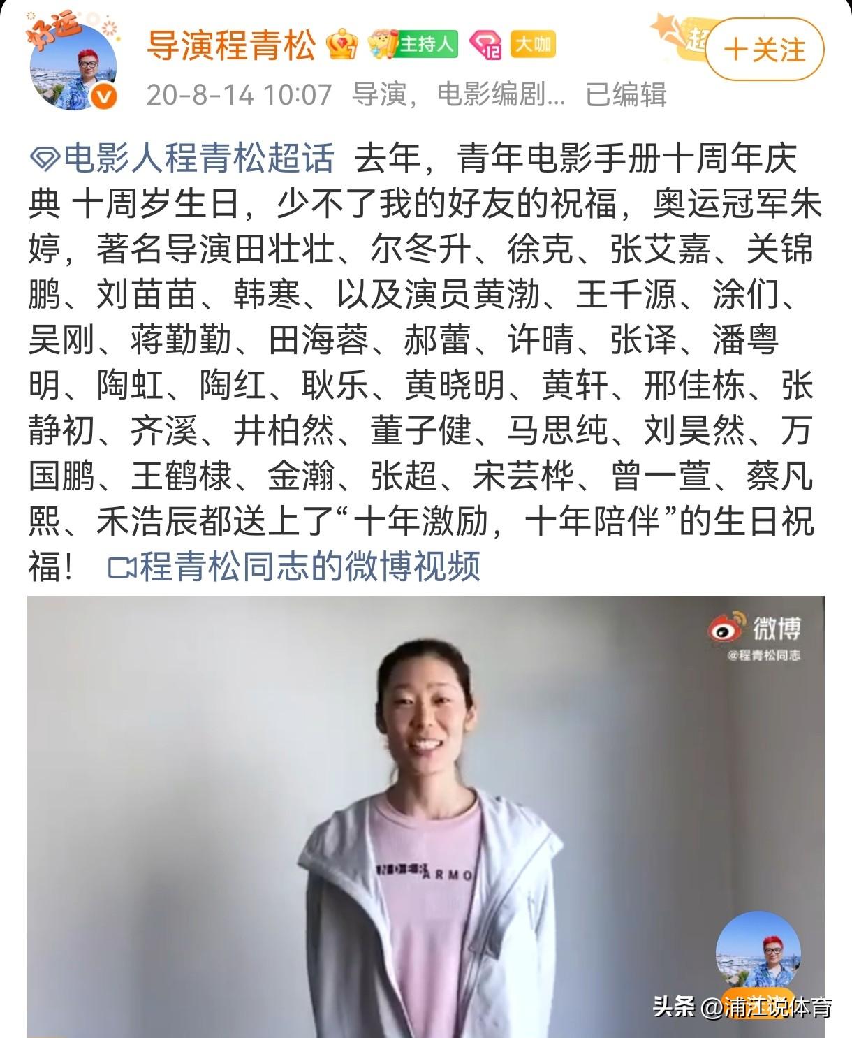 女排朱婷与姚迪曾参加导演程青松的晚宴,当时是在2019赛季排超半决赛比赛之后,程青松还夸赞朱婷有表演天赋,“不打球的话绝对可以演喜剧”。参加晚宴聚餐的还有男排教练胡松、以及朱婷妹妹朱佳荟,晚宴的安排者是演员胡明,不过胡明并未出现在聚餐现场。看得出来,朱婷与程青松也因此而结缘,并于第二年8月以“好友”身份还公开出镜并带头祝福了程青松的电影项目。程青松近期处于舆论的风口浪尖,不过他确实也是一位才华横溢的跨界创作者,而且口碑不错、好友众多,是一位跨领域的社交达人。