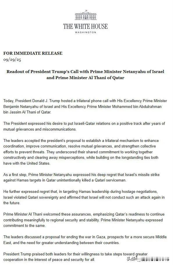 白宫证实,此前唐纳德·J·特朗普总统与以色列总理本雅明·内塔尼亚胡和卡塔尔首相穆罕默德·本·阿卜杜拉赫曼·阿勒萨尼会晤期间曾通话。内塔尼亚胡在通话中对以色列袭击卡塔尔首都多哈哈马斯目标表示深切遗憾。通话中,内塔尼亚胡进一步对以色列在人质谈判期间袭击哈马斯领导层侵犯卡塔尔主权表示遗憾,并重申以色列未来不会对卡塔尔发动此类袭击。