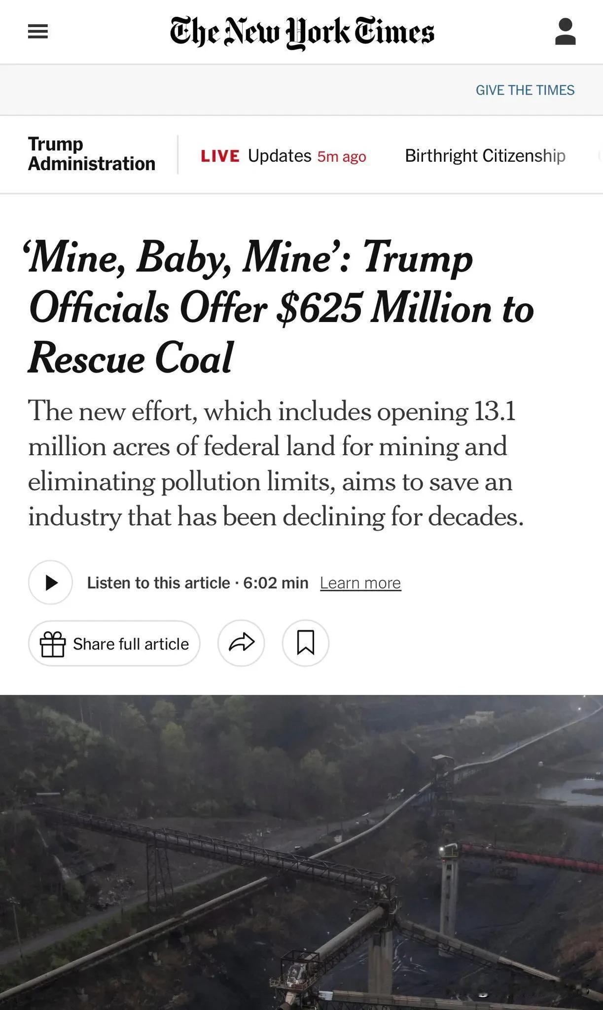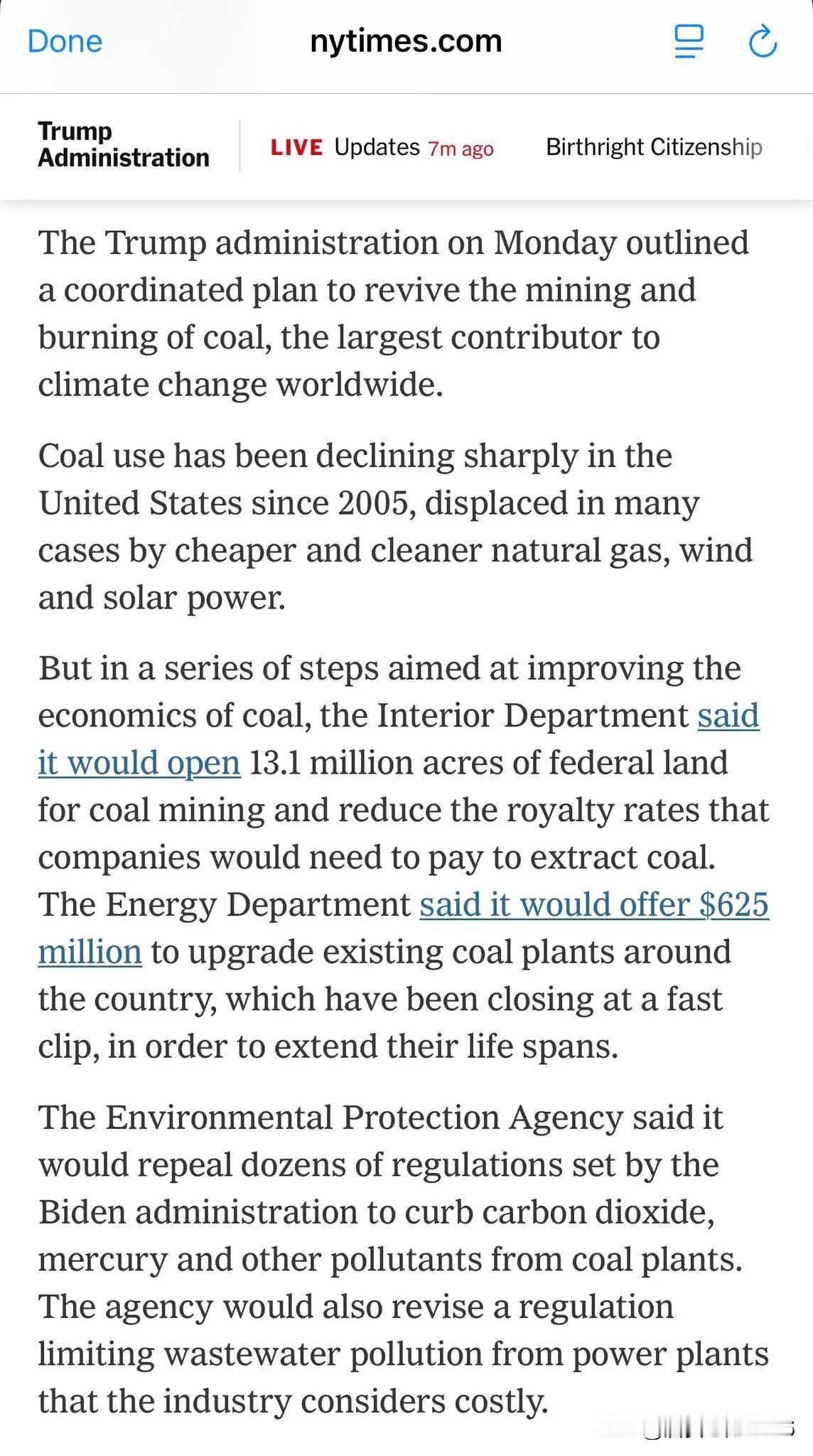 川普“干净、美丽的煤”。川普当局宣布将开放1310万英亩联邦土地用于挖煤矿,提供6.25亿美元资助,取消几十项环保限制措施,限制风能、太阳能。世界走向22世纪,美国走向19世纪。