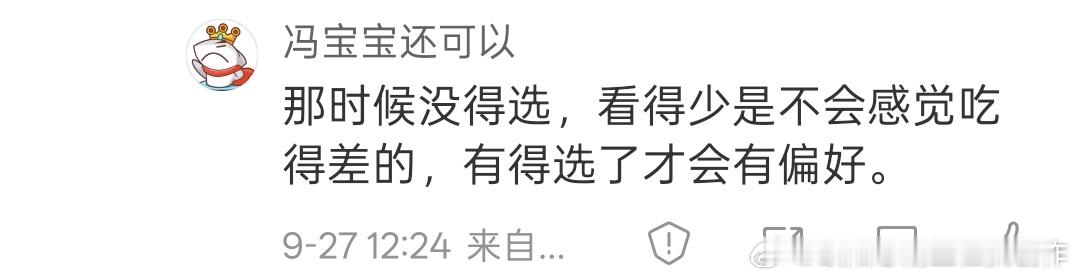 屎、尿、屁三样让你选,叫″有得选″吗?大大方方承认赵本山的小品、马三立的相声就是比现在喜剧大赛的、脱口秀大赛的强,而且强很多,怎么了?很难吗?现在的影视剧大多数是策划会产品,是廉价工业品,就是比几十年前的质量差很多,是不是现实?现在的各种恶臭饭圈们审美水平就是为零甚至是负的,没说错吧?