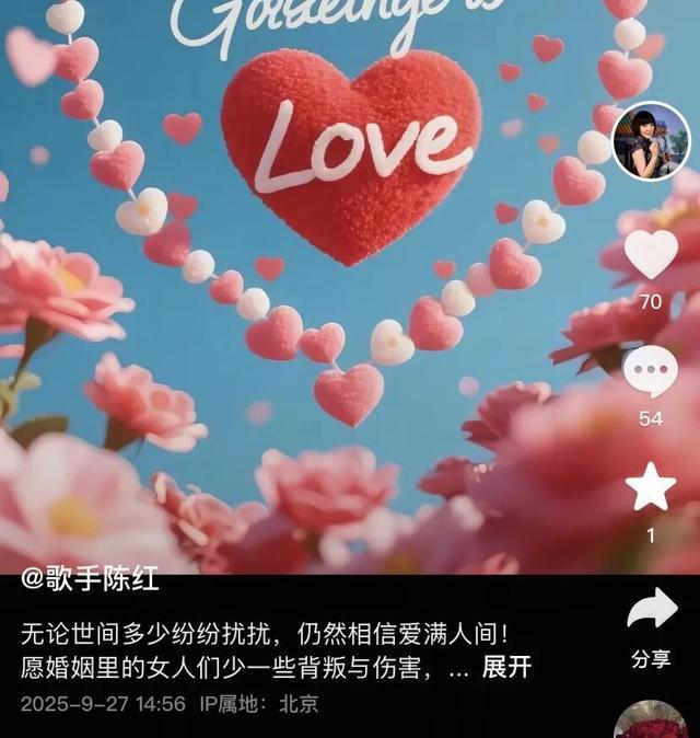 9月27日,陈红在抖音账号发文称,“无论世间多少纷纷扰扰,仍然相信爱满人间!愿婚姻里的女人们少一些背叛与伤害,愿男人多一些责任与担当,常回家看看!”