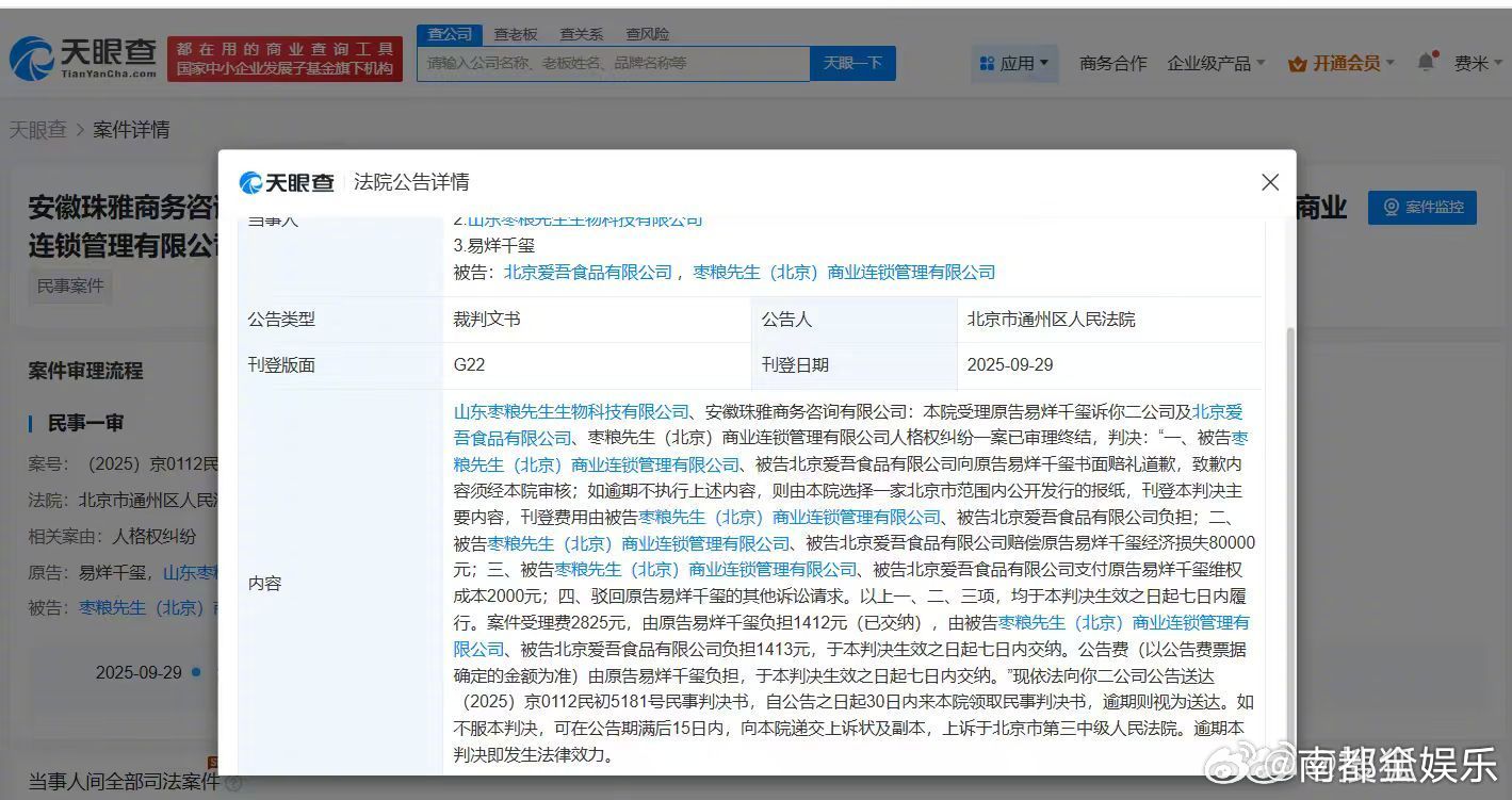 易烊千玺维权获赔8.2万据天眼查App显示,近日,北京市通州区人民法院向山东枣粮