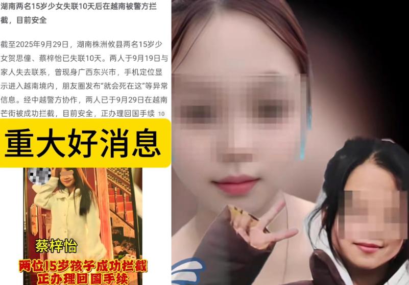 喜讯! 湖南攸县走失的两名15岁女孩,贺思僮和蔡梓怡,29日在越南芒街被发现,并