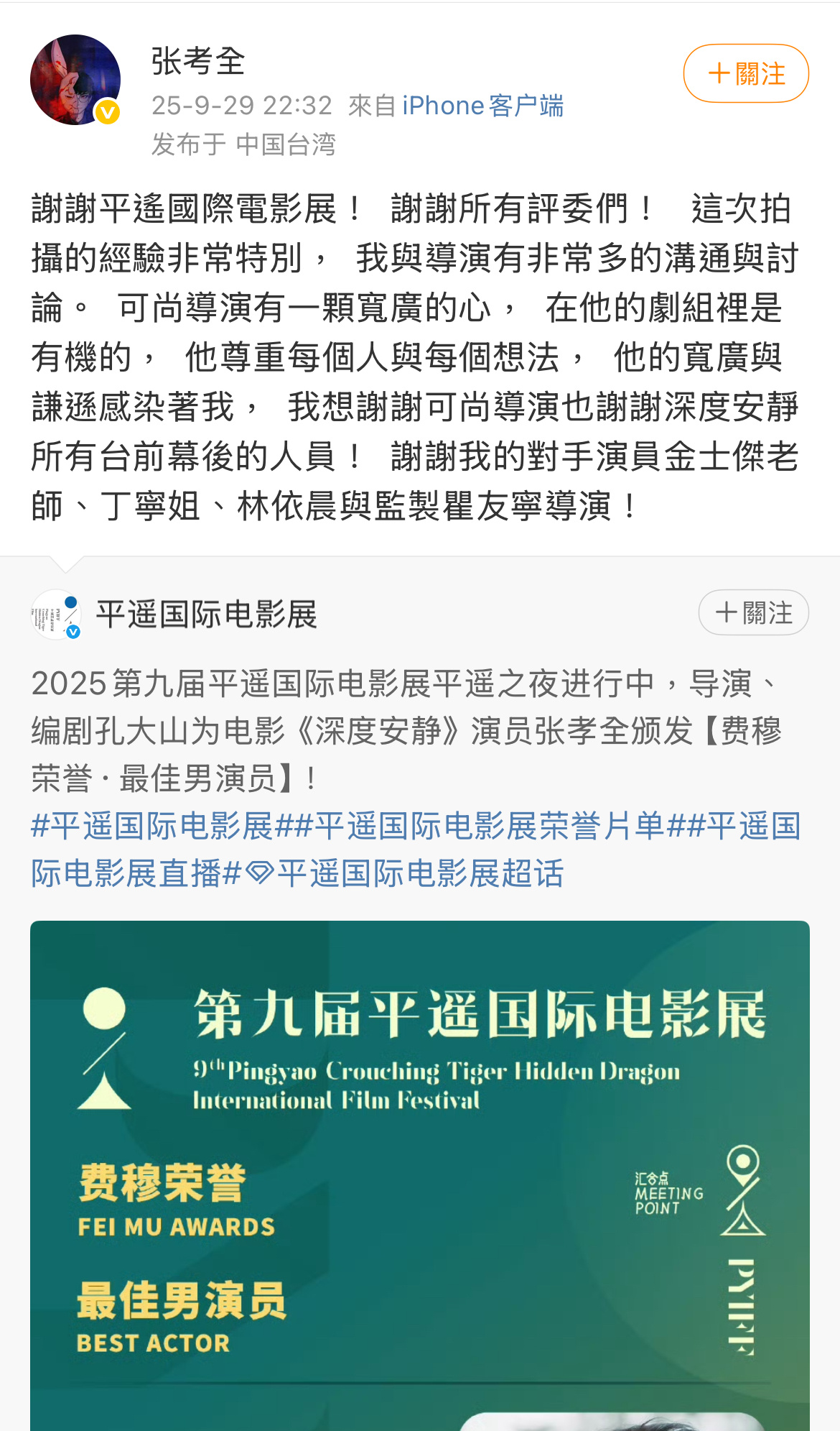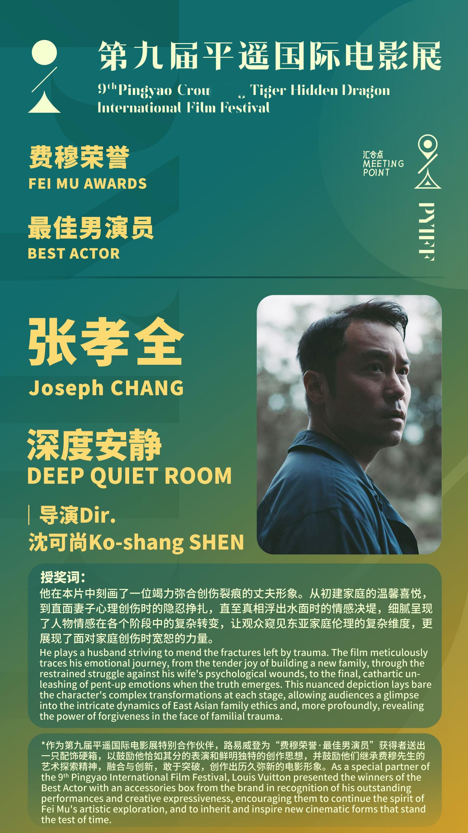 恭喜张孝全以电影《深度安静》拿下今年平遥国际电影展「费穆荣誉·最佳男演员」🎉👏电影《深度安静》也拿下了「费穆荣誉·最佳影片」🎉