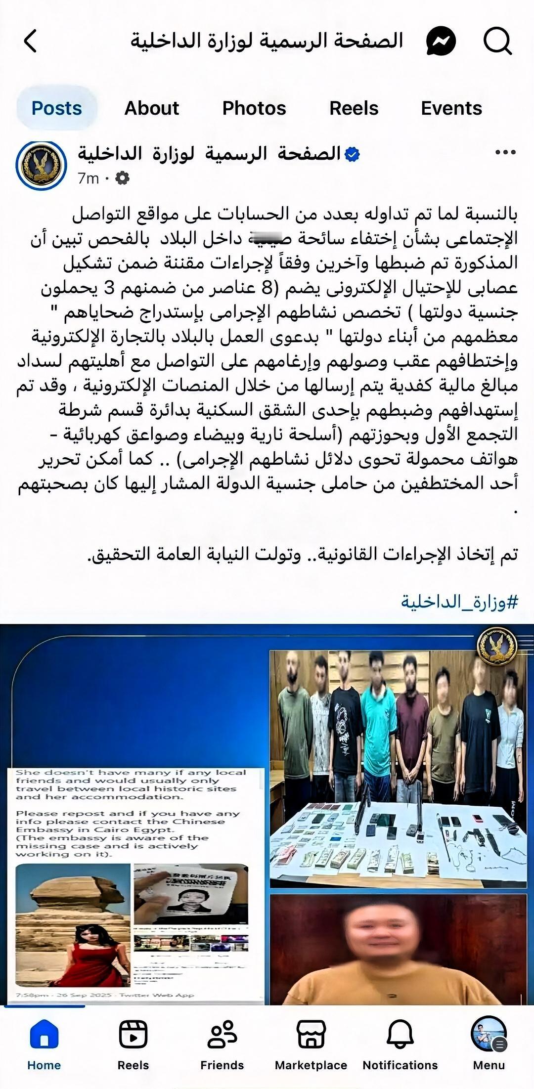 中国21岁女孩池广滢赴埃及一个多月后失联,结果却是进入电诈团队,如今因参与电诈和绑架同胞被埃及警方抓获…… 据埃及内政部官方社交账号今日凌晨通报,在9月22日失联的中国女孩终于找到了,可惜的是池某因参与电诈已被捕。 据悉,池某是8月9日抵达埃及,对外称是为了旅游和考察工作机会,9月22日左右与家人失联。 根据埃及内政部通报,池某是在开罗一所公寓内逮捕电诈团伙是被找到,当时警方还在现场查获了枪支、白刃武器、电击枪及作案手机,并解救出一名被绑架的中国同胞。该8人的电诈团伙以“提供电子商务工作”为诱饵,主要诱骗中国同胞抵达埃及后实施绑架,并强迫受害者向家人勒索赎金。 至于池某是主动参与犯罪还是从受害者变为加害者不得而知,但参与犯罪是事实。不过也说明我国联合东南亚国家打击电诈取得良好成效。 同时也给所有在海外或计划出国的人提了个醒,对所谓“高薪工作”、“商业考察”等邀约要保持高度警惕,务必通过官方渠道核实信息,切勿轻信他人,尤其是不认识的“自己人”!