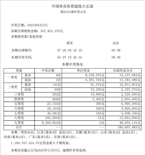 9月3日,超级大乐透第25101期开奖。前区开出号码05、07、19、26、32;后区开出号码08、09。本期全国销售3.07亿元,为国家筹集彩票公益金1.10亿元。