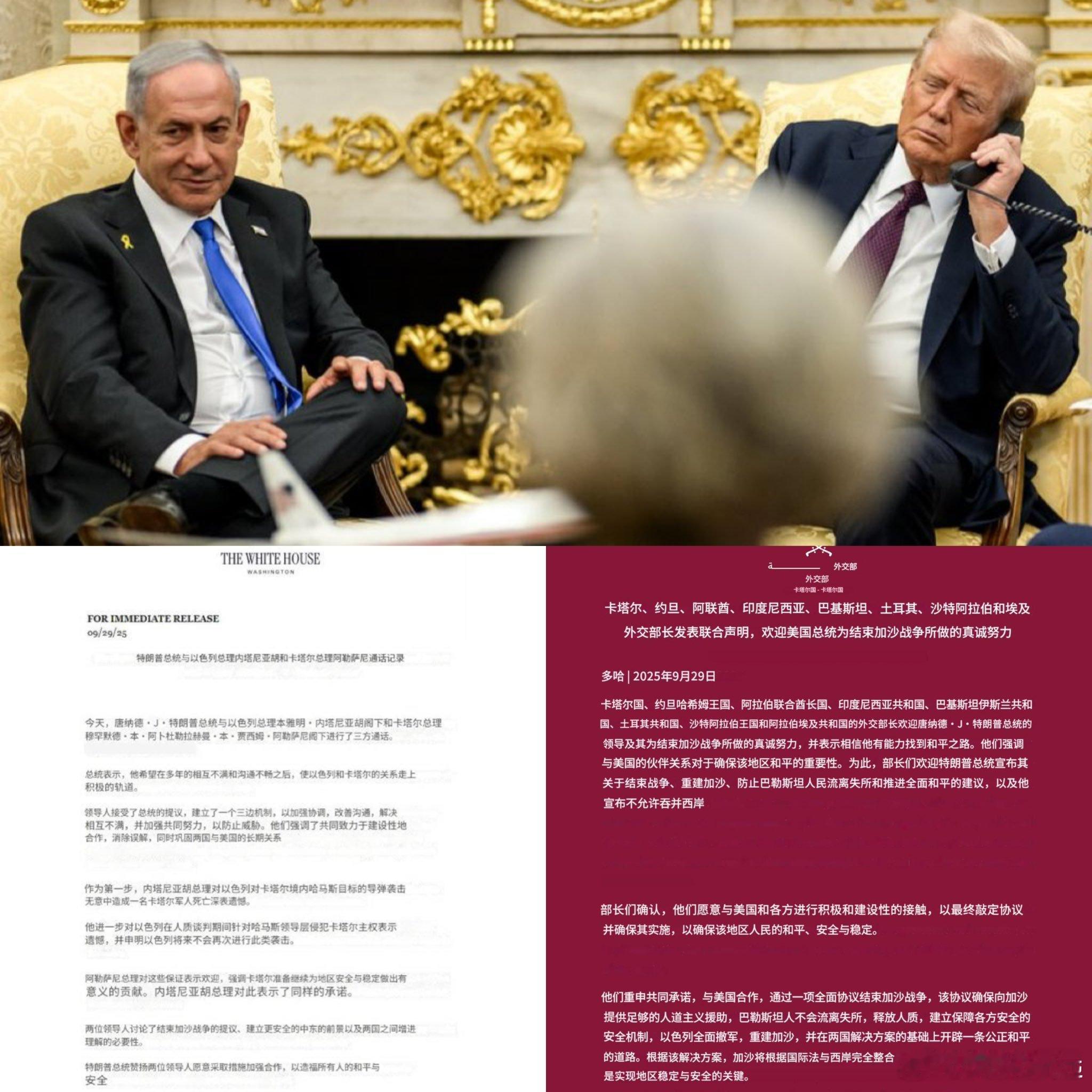 川普跟内塔尼亚胡私下会谈时,直接打了电话给卡塔尔首相,让内塔尼亚胡直接跟他道个歉,并发布了这个新闻照片