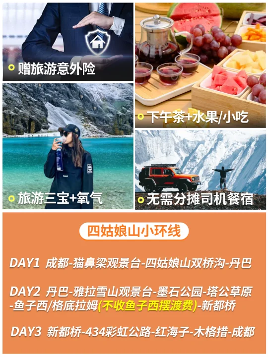 💖3天纯玩小团的行程串联起川西经典自然与人文景观,涵盖雪山、草原、海子、石林、彩林等多元地貌,既包含四姑娘山、雅拉雪山观景台等知名雪山观景地,也有墨石公园、塔公草原等网红打卡点,还能体验 434 彩虹公路的自驾乐趣,兼顾风光与性价比,非常时间适合时间较短也想玩一趟川西的宝子
