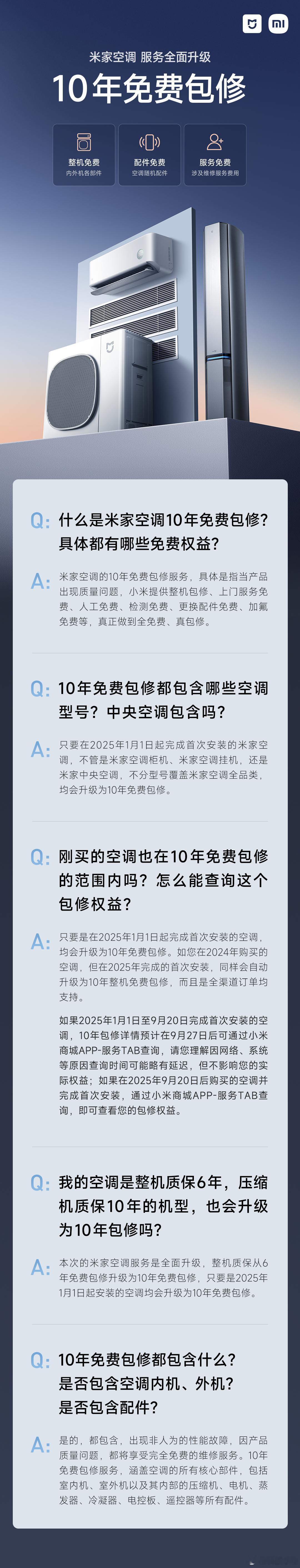 只要在2025年1月1日起完成首次安装的米家空调,不管是米家空调柜机、米家空调挂机,还是米家中央空调,不分型号覆盖米家空调全品类,均会升级为10年免费包修。