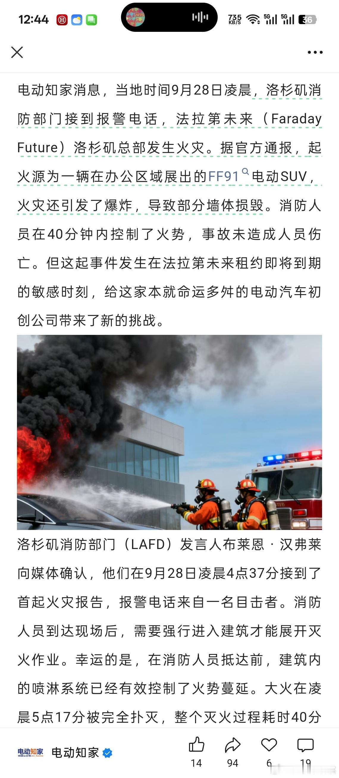 网传贾跃亭的FF总部火灾,起因是车辆自燃