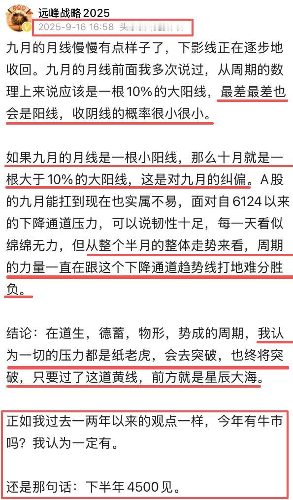 九月最后一个交易日结束了,今天终究还是没有大幅拉升,3900还是没有去突破,有点遗憾,有点遗憾呀。今天九月的月线也收官了,收了一颗十字阳线,跟过去的预期差不多,最差最差也会收阳线,收阴线的概率很小很小,几乎没有。这也是为何下午我如此积极看突破3900的重要原因。 九月在周期的数理里面本身就是要拉升的月份,现在没有拉升,那么十月份就精彩了,我中旬的时候说过,如果九月没有大阳线,那么十月就是大阳线,这是对九月的纠偏,整个四季度的季线依旧会是阳线,且会见到4500。 无论如何,九月都结束了,虽说有些许遗憾,但股票本来就是一门遗憾的艺术,要想减少点遗憾,最好的办法就是手中有股,心中无股。 明天长假也开始,顺祝你们假期愉快,回来后再见证四季度的高光时刻。