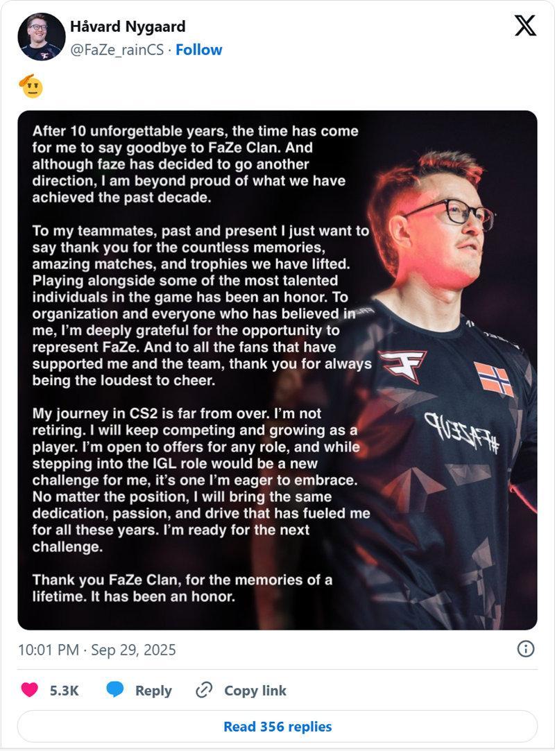 再大的雨也终究会停!FaZe战队已宣布将长期队员rain调整至替补席,为Twistzz重返首发阵容铺路。此前,这位加拿大选手从Liquid战队转会至FaZe,而EliGE则以反向转会的方式加盟Liquid。