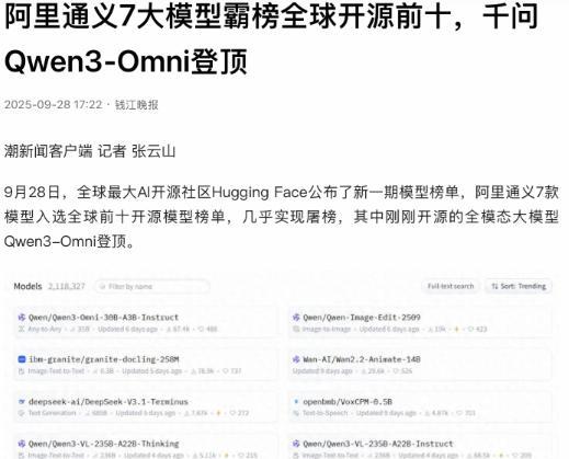 世界正在重新评估中国的真正实力。就在9月28日,全球最大的AI开源社区Hugging Face发布新榜单,阿里通义竟有7款模型杀进全球开源前十,刚刚开源的全模态大模型Qwen3-Omni直接登顶,通义系列模型完成了“屠榜”! 这话听着就解气,毕竟之前总有人嚼舌根,说中国在基础模型领域只会跟在别人后面模仿,没什么真本事。 现在Hugging Face这张榜单往这儿一摆,所有质疑声都跟被按了静音键似的。 要知道这可不是什么自家办的小评比,全球上百个开源模型都在这儿比,测试维度从阅读理解到数学推理占了六大类,能在这儿拿第一,含金量比纯口头吹嘘实在多了。 登顶的Qwen3-Omni更是个狠角色,刚开源就直接站上顶端。这模型可不是只会处理文本的“偏科生”,文本、图像、音频、视频全能接招,相当于给开发者配了个十项全能的助理,不仅能实时语音对话,还能自定义人格,十几种语言切换着来都不费劲。 36项公开评测里它拿了32个开源第一,22项都创下了新纪录,连Gemini-2.5-Pro、GPT-4o这些闭源大模型都被它压过一头,哪儿是什么模仿啊,这分明是把“天花板”直接捅破了再往下递台阶。 再看另外6款闯进前十的模型,各有各的绝活,根本不是凑数的。有个叫Qwen3-Max的,万亿参数撑场面,36万亿tokens喂出来的本事,编程和智能体能力直接冲进全球前三,连GPT-5-Chat都被它超过了。 还有款Qwen3-Next更接地气,用小轿车的“油耗”跑出了跑车的性能,30亿激活参数就能达到2350亿密集模型的效果,训练成本砍了九成,普通开发者和小企业终于不用对着高端AI望而却步了。 更有意思的是这七款模型凑在一起的架势,简直是把AI应用的关键环节全包了。想搞视觉开发?Qwen3-VL能把草图直接变成代码,产品经理画个图就能出网页效果。 想写代码修bug?Qwen3-Coder就是个随时在线的搭档,还能直接部署完整项目。甚至想拍短片?Wan2.5-preview能生成电影级的视频,音画同步做得比不少专业工具还顺。 这哪是零散的模型发布,分明是搭好了一整套生态拼图,不管你是做什么的,总能从里头找到能用的那块。 现在全球开发者搜“qwen”,出来的相关模型都超过16万个,通义系列总下载量早破了6亿次,衍生模型就有17万个。以前总有人觉得中国AI是“跟跑选手”,现在看来,早悄悄变成“领跑者”了。 这波屠榜哪儿是什么突然爆发,分明是一步步攒出来的实力——从参数训练到架构创新,从单个模型突破到全模态生态布局,每一步都踩得很实。 那些说“只会模仿”的论调,现在再听就像个笑话。Hugging Face上的数据不会说谎,全球开发者的选择更不会说谎。 通义这波操作算是把话挑明了:中国AI不仅能跟上节奏,还能自己定规矩,自己做标杆。 世界重新评估中国实力?其实实力一直都在,只是这回借着榜单,亮得更清楚罢了。