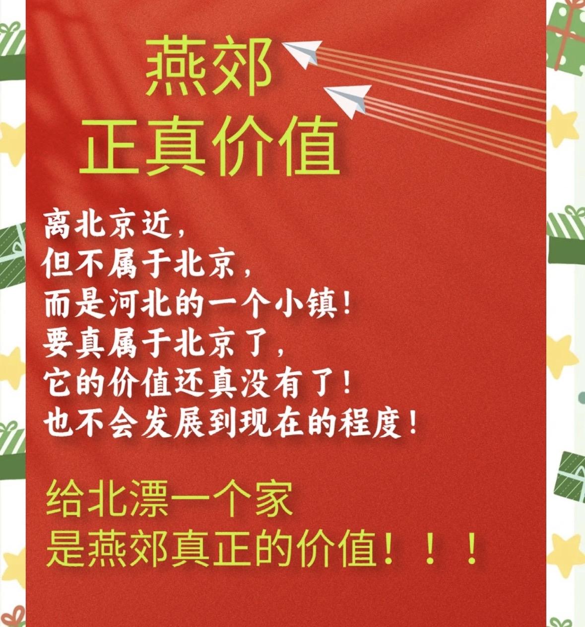 燕郊地铁开通以后,房产不用炒,必然会升值,包括通州副中心在内的房产也会拉升!!原因很简单,人多的地方,就有经济!! 燕郊常住人口就超百万,算上流动人口,已经一百多万,区域性经济必然会上升,随着地铁开通,还会有更多人涌入燕郊,经济只能越来越好!! 很多人忽略了燕郊的价值,他不只是睡城,还是你家人和孩子生活和学习的地方,这个北京城内是做不到的,这就是燕郊通地铁以后独有的价值: 可落户~可就读~可通勤(地铁)