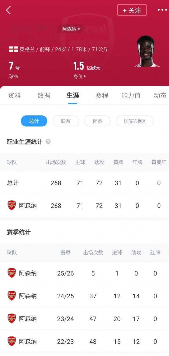 根据capology的数据,萨卡目前在阿森纳的周薪为19.5万镑,该合同在2023年5月签下。