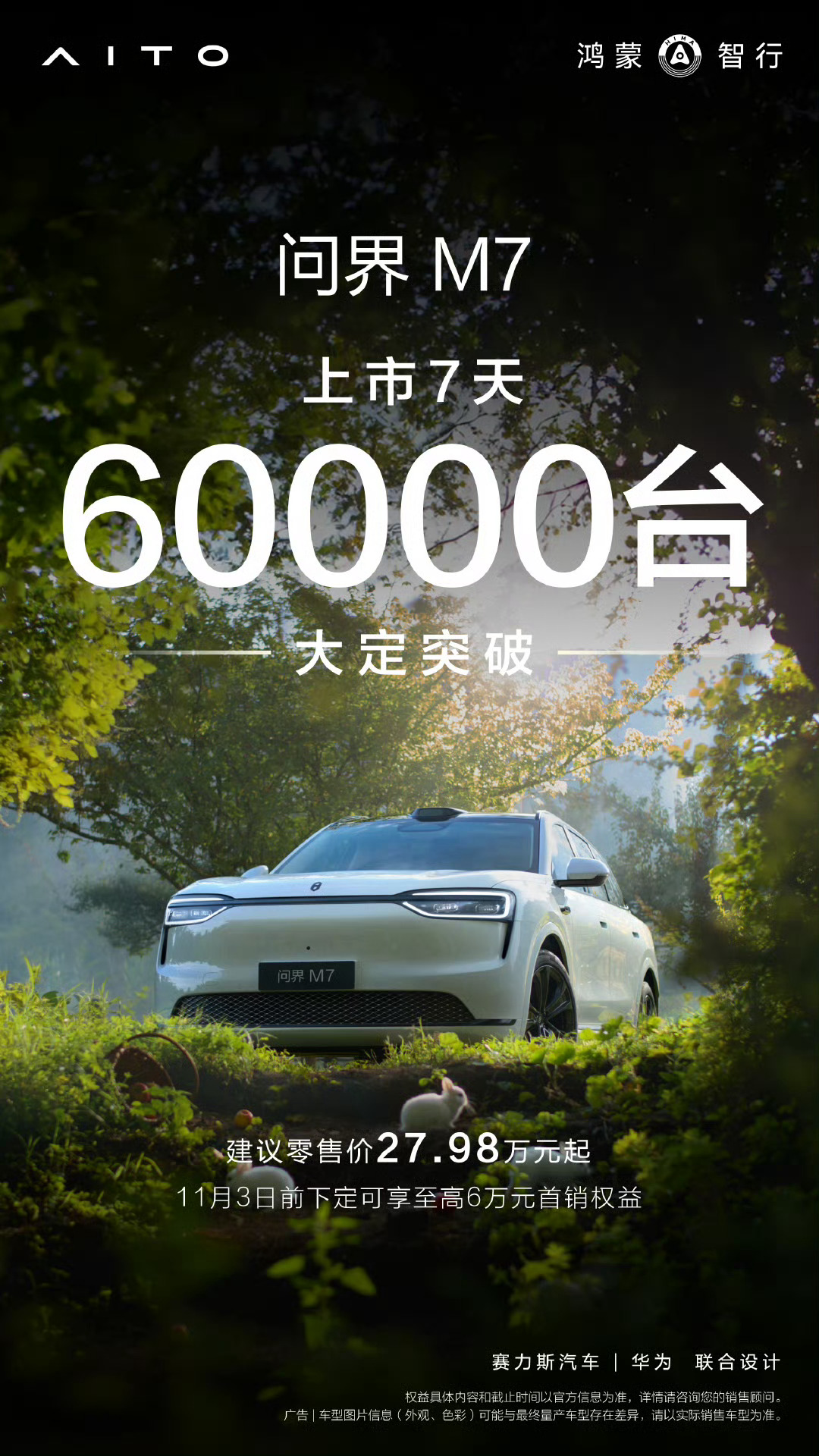 今天刚说完新款问界M7大定要冲破6万台,底下评论区还一堆人冷嘲热讽,结果下午战报