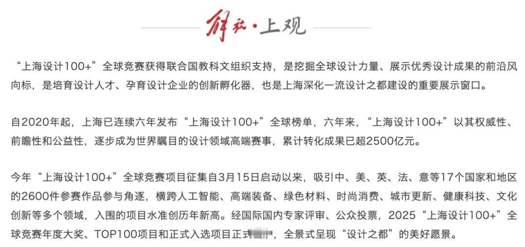 2025年“上海设计100+”全球榜单于近日正式发布,本届竞赛吸引中、美、英、法