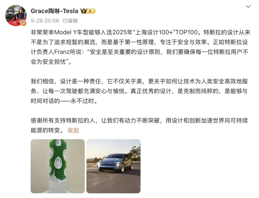 其中,特斯拉Model Y入选2025年“上海设计100+”全球竞赛,并跻身TOP100。