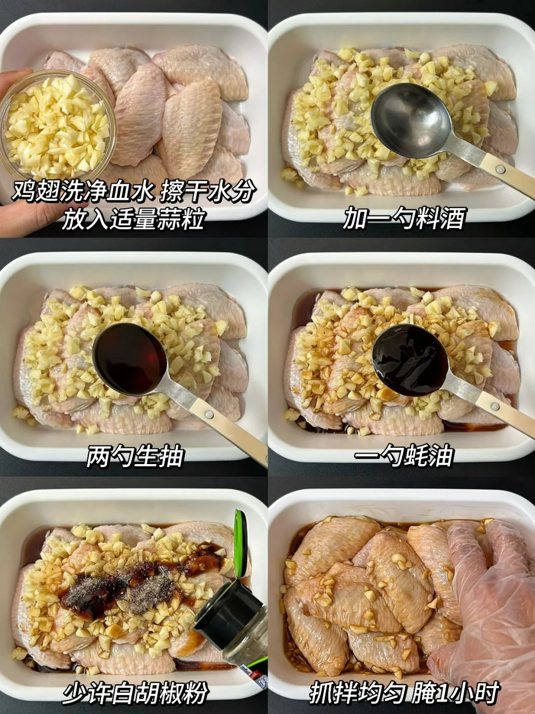 1️⃣鸡翅洗净血水,参考图片腌制入味。拣走蒜粒,加2勺红薯粉抓拌至粘稠(觉得太干就加一丢丢水)