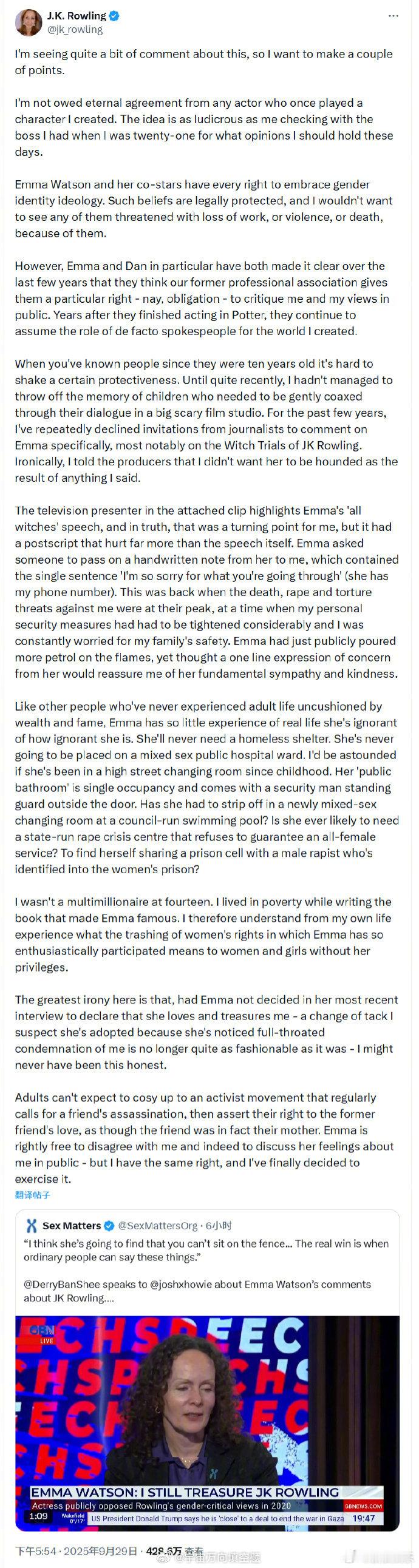 罗琳说自己遭受死亡威胁时艾玛曾托人转交过一封亲笔信,她称:“艾玛在公开场合火上浇油后,竟以为这句轻飘飘的关切就能让我相信她本质上的善意”;她还说艾玛在最新访谈中突然宣称依然敬爱我,是因为她发现社会风向变了,对我的公开谴责已不再时髦。(新浪娱乐、环球时报)