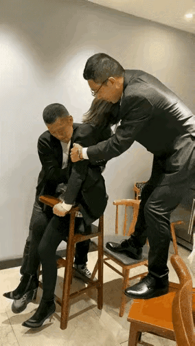 无知的女人,一个成年人坐进小孩子坐的一张椅子里面去,被卡住出不来了,两个大男人将
