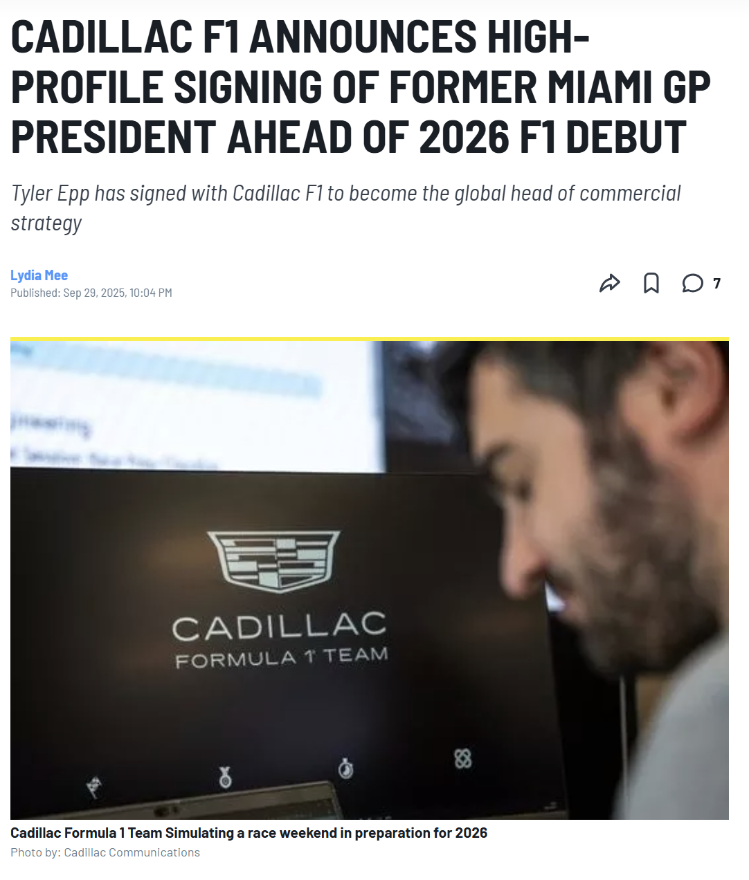 凯迪拉克F1车队宣布任命前迈阿密大奖赛总裁泰勒·埃普成为全球商业战略负责人,这支车队将于2026赛季首次亮相于F1世界锦标赛。
