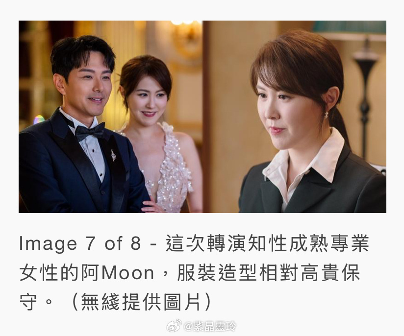 這次轉演知性成熟專業女性的阿Moon,服裝造型相對高貴保守,但仍有不少女性化detailed位符合豪門媳婦身分。先說開場的黑色Suit,配以下襬的黑紗長裙,低調中見艷光;之後阿Moon在世紀婚宴上的蝦肉色低胸連身裙、及另一個古典長髮配以時尚感十足的絲質恤衫,均突顯了她簡潔優雅、睿智沉穩一面。
