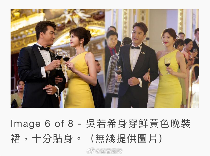 除了宣萱,吳若希(Jinny)和劉佩玥(Moon)的造型亦各有特色!先說吳若希,飾演巴辣王家大嫂的她,造型相對較為冶艷、除了大Red唇妝容、衣服的顏色亦偏向鮮艷,首集亮相的便先後有鮮黃色及火紅晚裝裙,而且每件都超貼身。