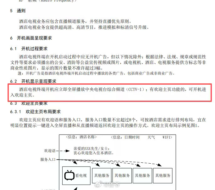 广电总局这个创意好,要求酒店电视终端开机应立即全屏播放CCTV-1