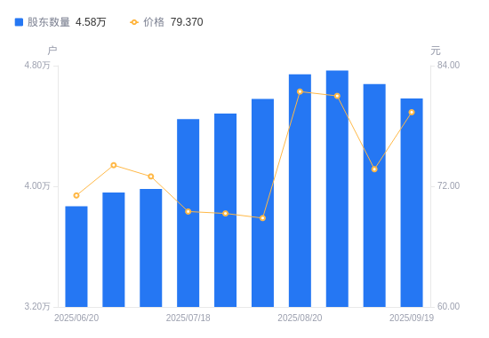 日期A股户数(户)流通A股户均持股数(股)户均持股市值(万元)2025-09-19458284825.8138.302025-09-10467784727.8034.842025-08-29476704639.3437.572025-08-20474274663.1137.972025-08-08457934829.5033.252025-07-31448244930.7834.172025-07-18444614971.0334.542025-07-10398225550.1340.502025-06-30395835583.6441.372025-06-20386715716.2240.64