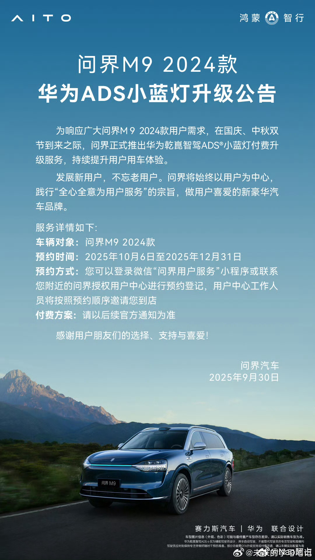24款问界M9小蓝灯的付费升级方案来了