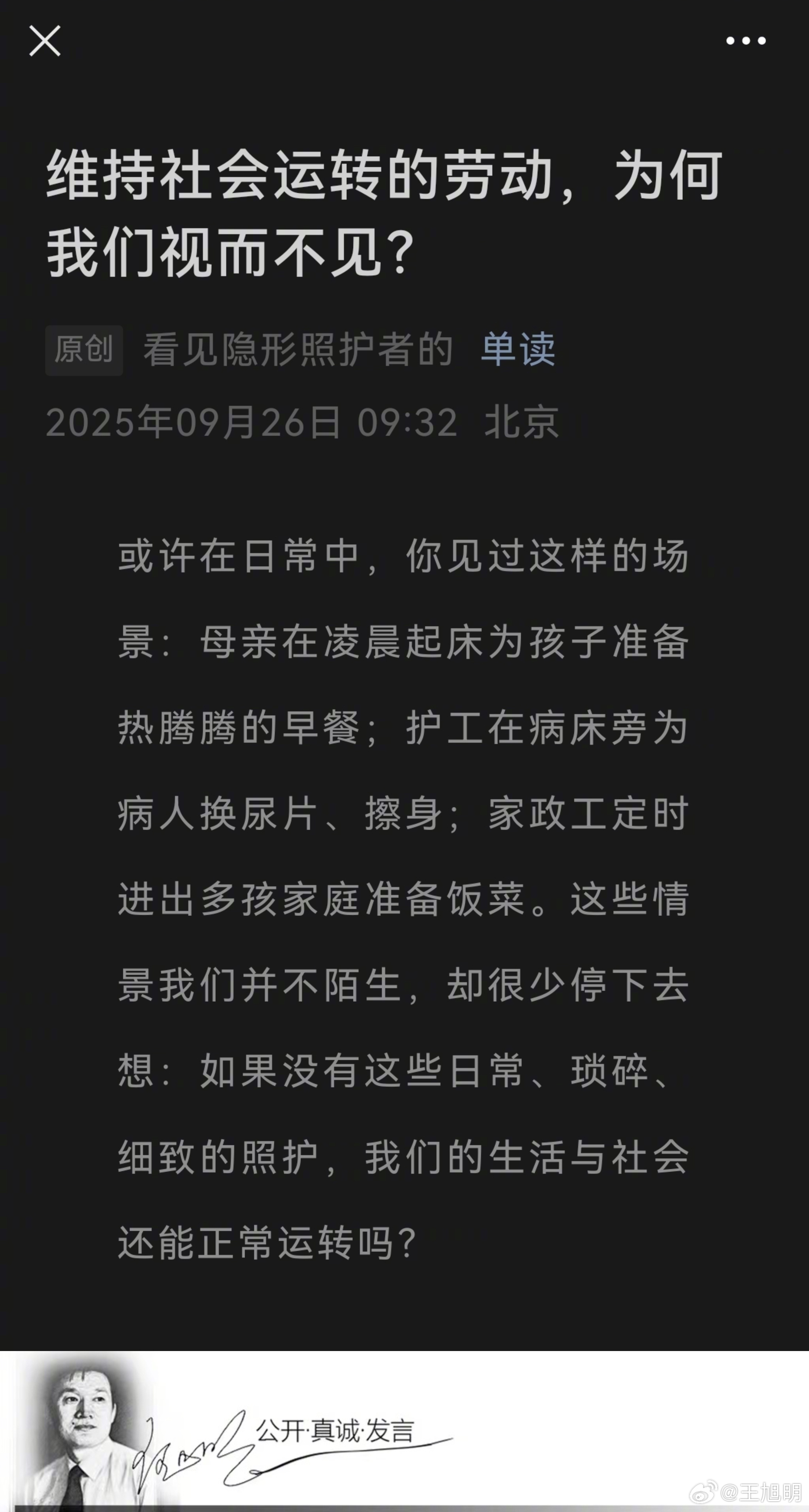 文章以“或许在日常中,你见过这样的场景:母亲在凌晨起床为孩子准备热腾腾的早餐;护工在病床旁为病人换尿片、擦身;家政工定时进出多孩家庭准备饭菜。这些情景我们并不陌生,却很少停下去想:如果没有这些日常、琐碎、细致的照护,我们的生活与社会还能正常运转吗?”为开头,提出了一个不为人关注、确实是很大很大的一个问题:如果没有这些日常、琐碎、细致的照护,我们的生活与社会还能正常运转吗?