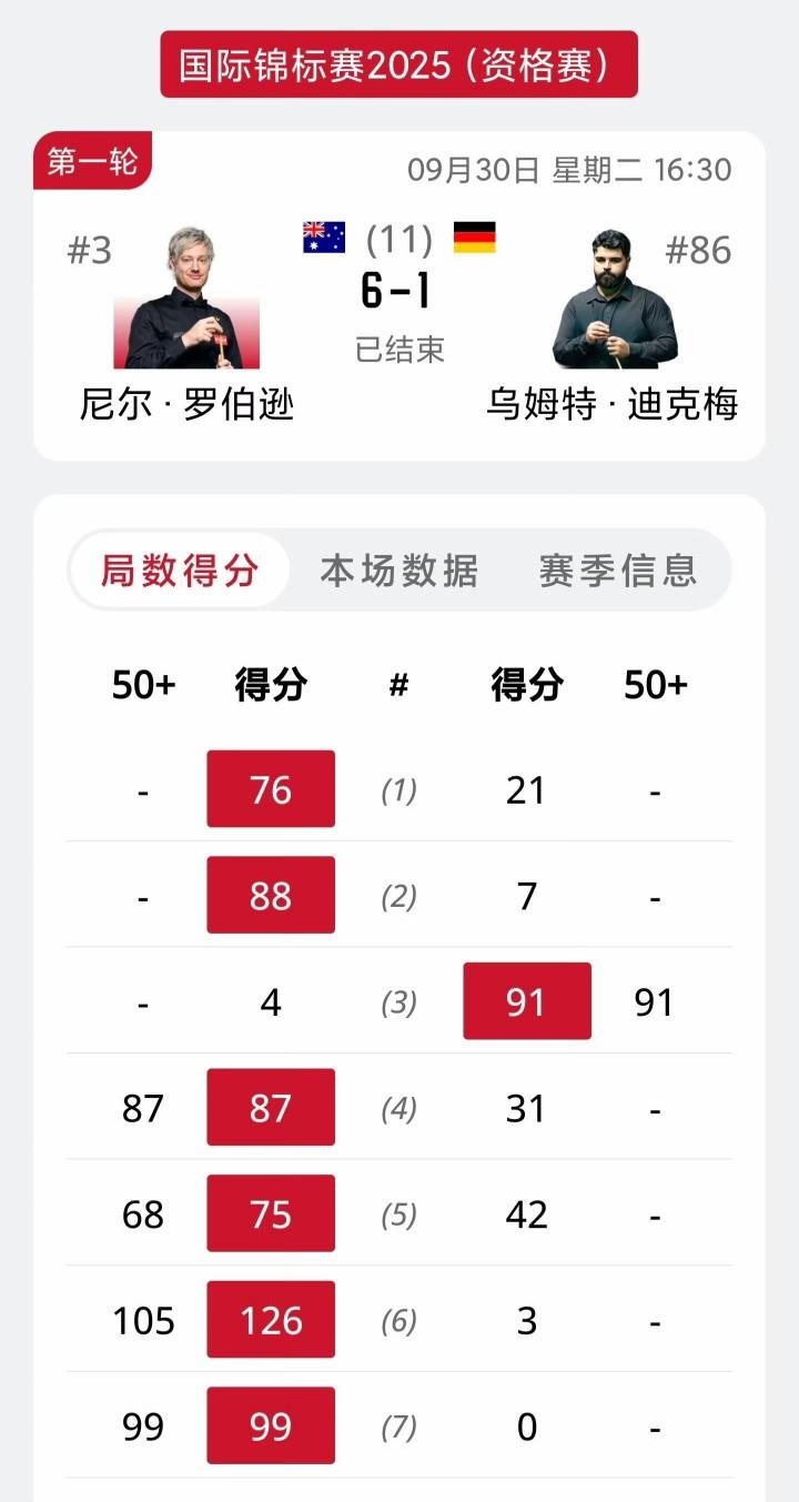 澳洲火炮完成千杆里程碑!2025斯诺克国锦赛资格赛对阵迪克梅的比赛中,罗伯逊以6