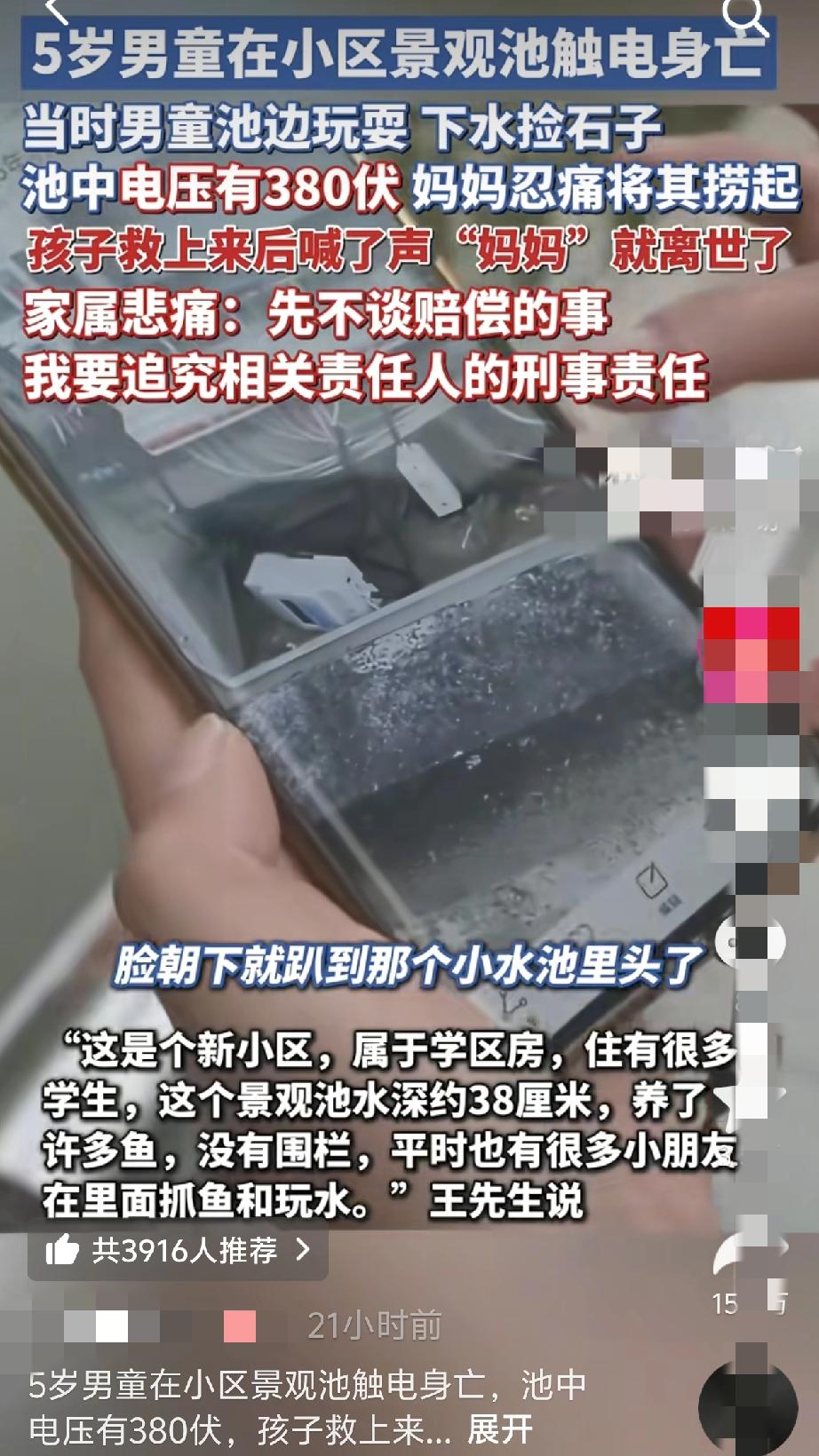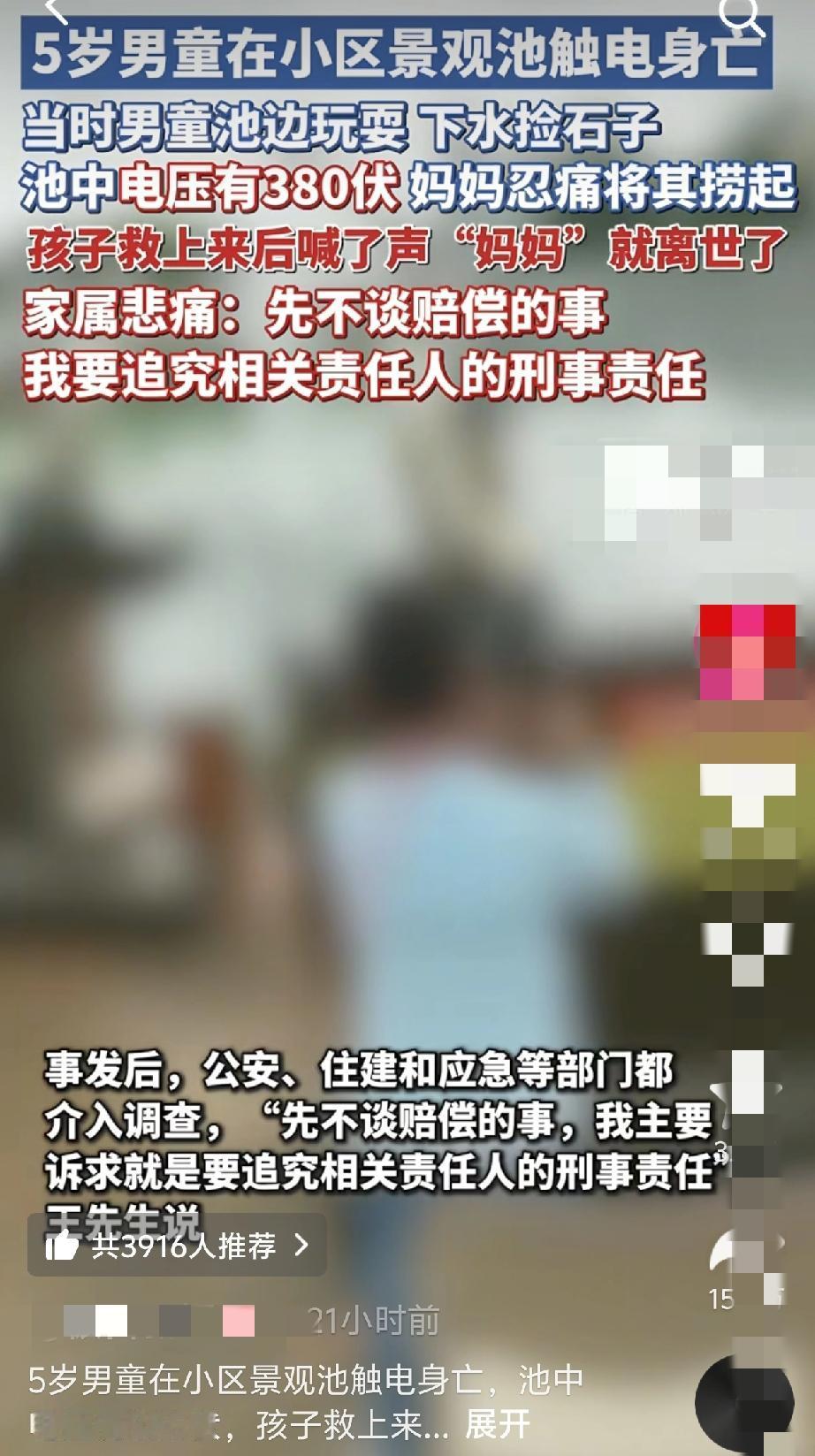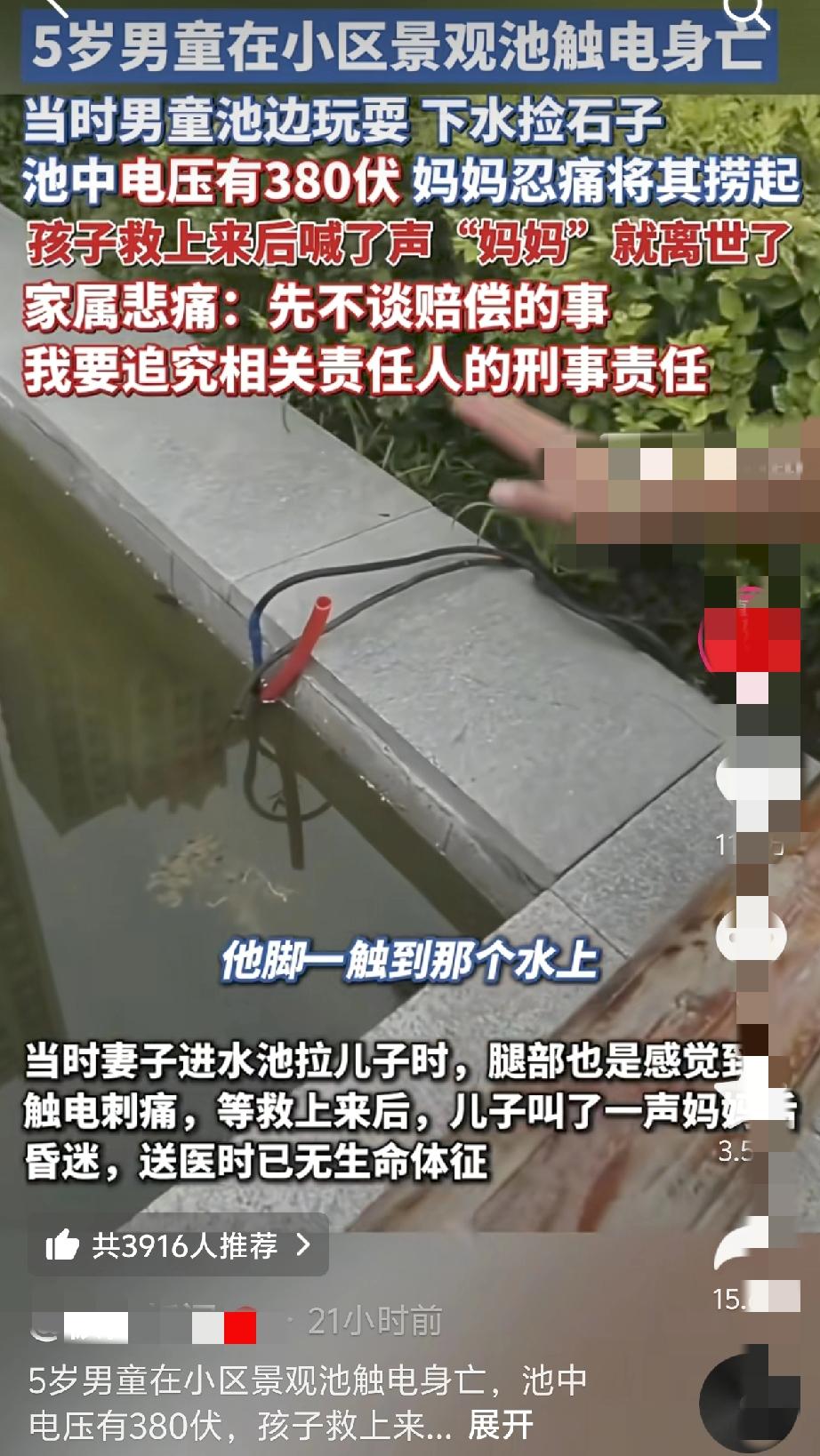 “意外还是发生了!”在内蒙古通辽,5岁的男孩在小区里的景观水池里玩耍时,不慎触碰到高伏电身亡,调查原因令人气愤填膺。 孩子生前最后喊了一句“妈妈”,然后就离开这人世间。 “事发当天,5岁的儿子在景观池边玩耍,他想要捡水池里的石头,于是就下到景观池里,没过一会儿就触电了。”孩子的家属说。 母亲将儿子给抱了出来,就在走进水池里的时候,感觉到腿上有麻麻的感觉,显然是里面的装置漏电了。 在调查过程中发现小区里设置景观池和假山存在安全问题。本该设有电压十多伏的景观池,居然有380伏之高。 若不是有这么高的电压,孩子也不至于会触电身亡。 小区负责人并没有检查好景观池的设施是否安全,酿成了这一惨祸。 小区物业工作人员想让孩子父亲不要追究刑事责任。可以多做出一些赔偿,但是父亲只想给孩子讨回公道。 孩子家属表示赔偿先不谈,一定要追究责任人的责任。 这并不像石头绊倒了一个孩子,磕磕碰碰难免,至少孩子还在。 活生生的一个孩子就这样没了,而这个是完全可以避免的。 这是工作人员的疏忽,如果平日里多做好这方面的检查,就不会有这种事情发生了。