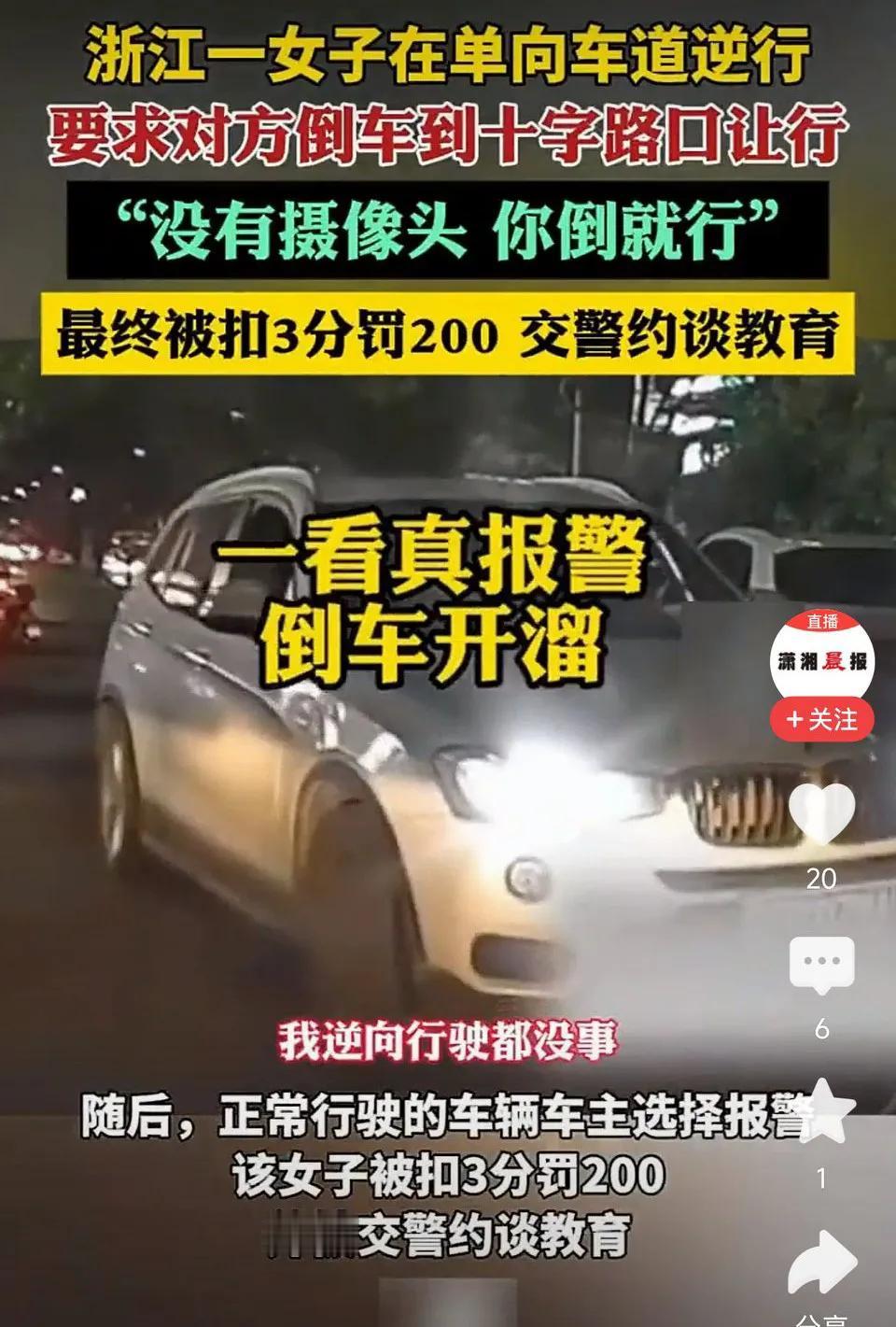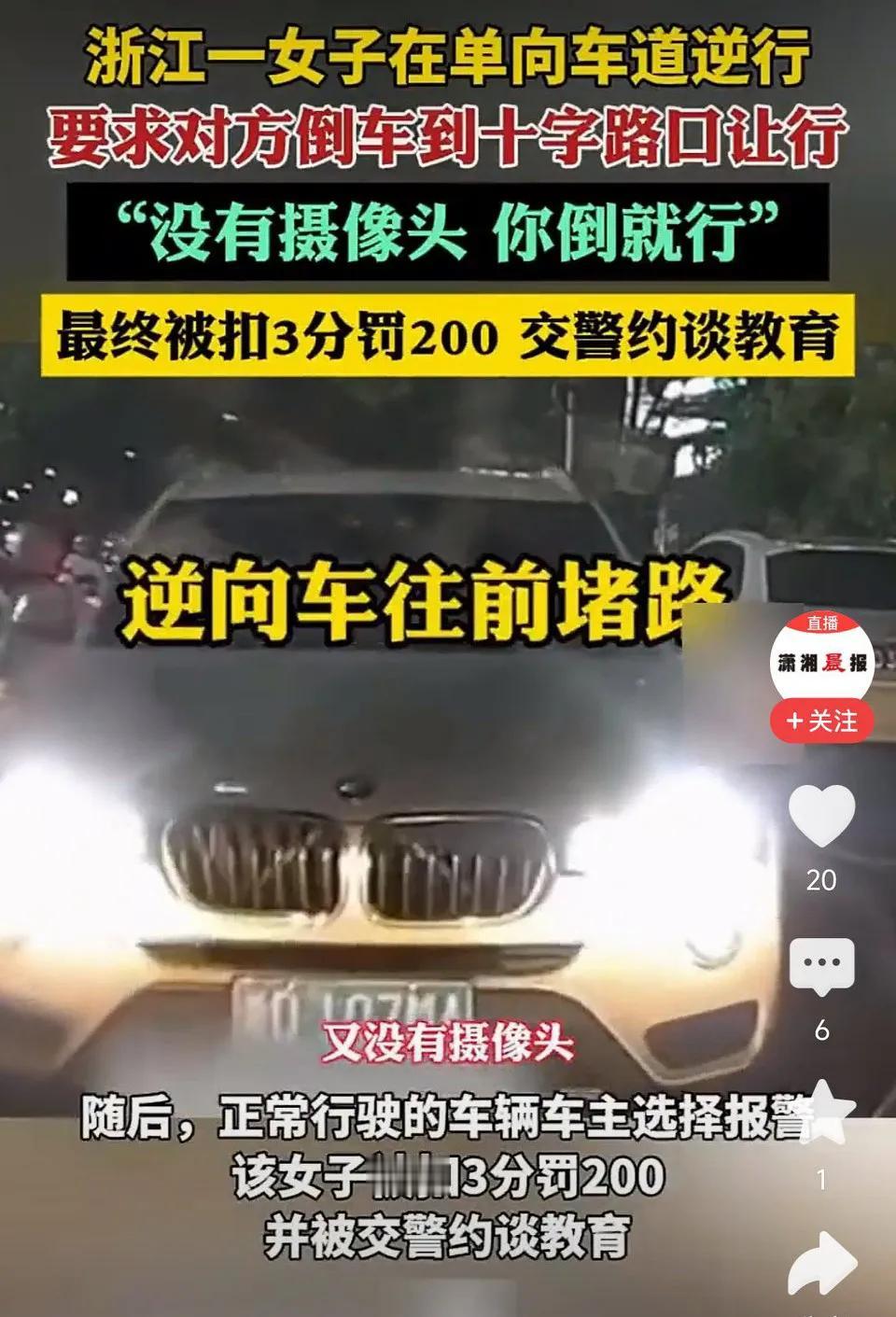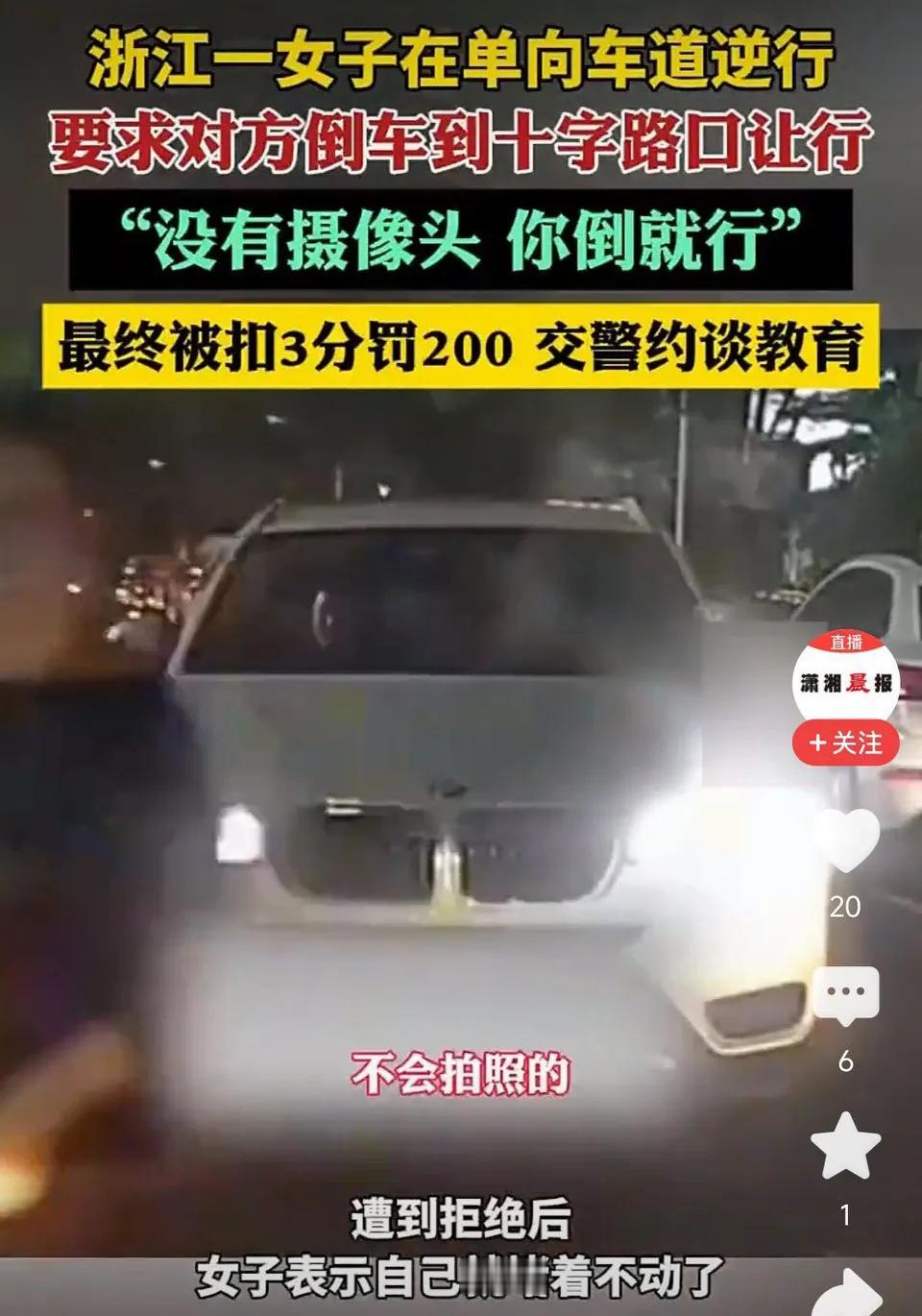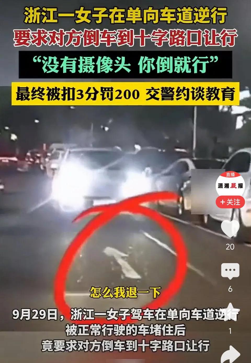 “没有摄像头,你倒就行!”浙江一女子在单向车道逆行,竟要求对方倒车让行! 网友表