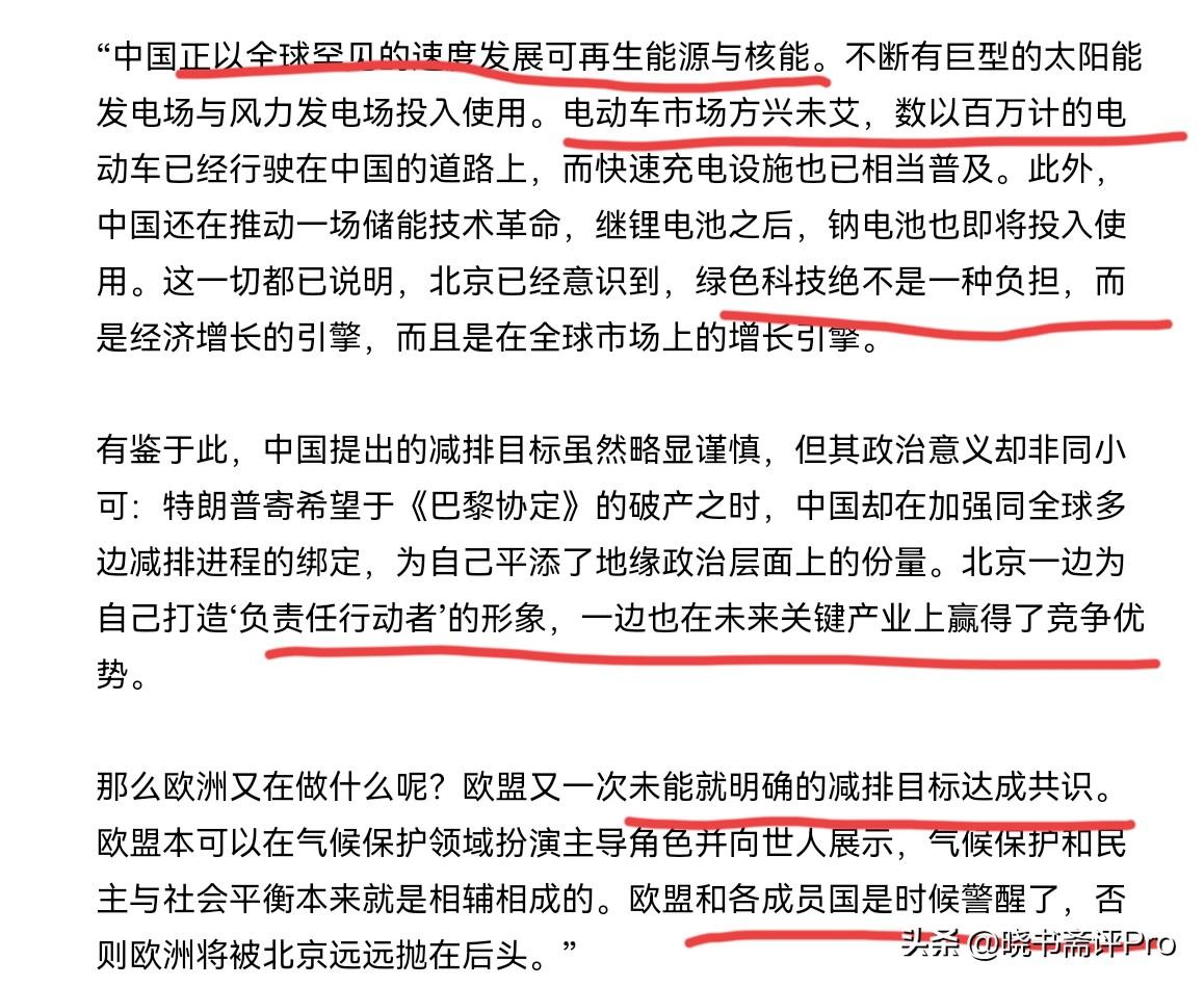欧盟被打脸了!这一次德媒揭了欧洲的老底!在我们设定削减7%至10%的减排目标之后,欧洲第一时间把矛头对准我们。欧盟气候事务主管沃普克·霍克斯特拉声称,中国提交的国家自主贡献远低于我们认为现实可行、符合要求的水平。这一目标明显令人失望,并敦促我们提高减排目标。没想到,欧洲官员刚对我们进行批评,德国媒体却站出来揭了欧洲的老底子。 9月30日,德国之声刊文声称,欧洲完全忽视了事实。德媒表示,中国正以全球罕见的速度发展可再生能源与核能。不断有巨型的太阳能发电场与风力发电场投入使用。电动车市场方兴未艾,数以百万计的电动车已经行驶在中国的道路上,而快速充电设施也已相当普及。但,在欧洲发生的是什么呢? 德媒表示,在欧洲,欧盟又一次未能就明确的减排目标达成共识。欧盟本可以在气候保护领域扮演主导角色,并向世人展示欧洲的影响力。但现实是欧洲正被北京远远抛在后头。北京正一边为自己打造负责任行动者的形象,一边也在未来关键产业上赢得了竞争优势。 很显然,面对欧盟官员对我们的批评,德媒这一次是不留情面的打了欧盟的脸。 很显然,德媒看见了中国的新能源产业发展方兴未艾,中国的新能源产业正处于世界领先地位,中国在致力于能源转型方面,事实上扮演着领头羊的角色。在这样的背景下,欧洲却对我们提出批评,这也只能说欧洲是言语上的巨人,行动上的矮子,欧洲根本没有资格批评我们。如果欧洲还是一副自以为是的样子,欧洲恐怕不仅损害自己的形象,事实上也在输掉产业竞争。