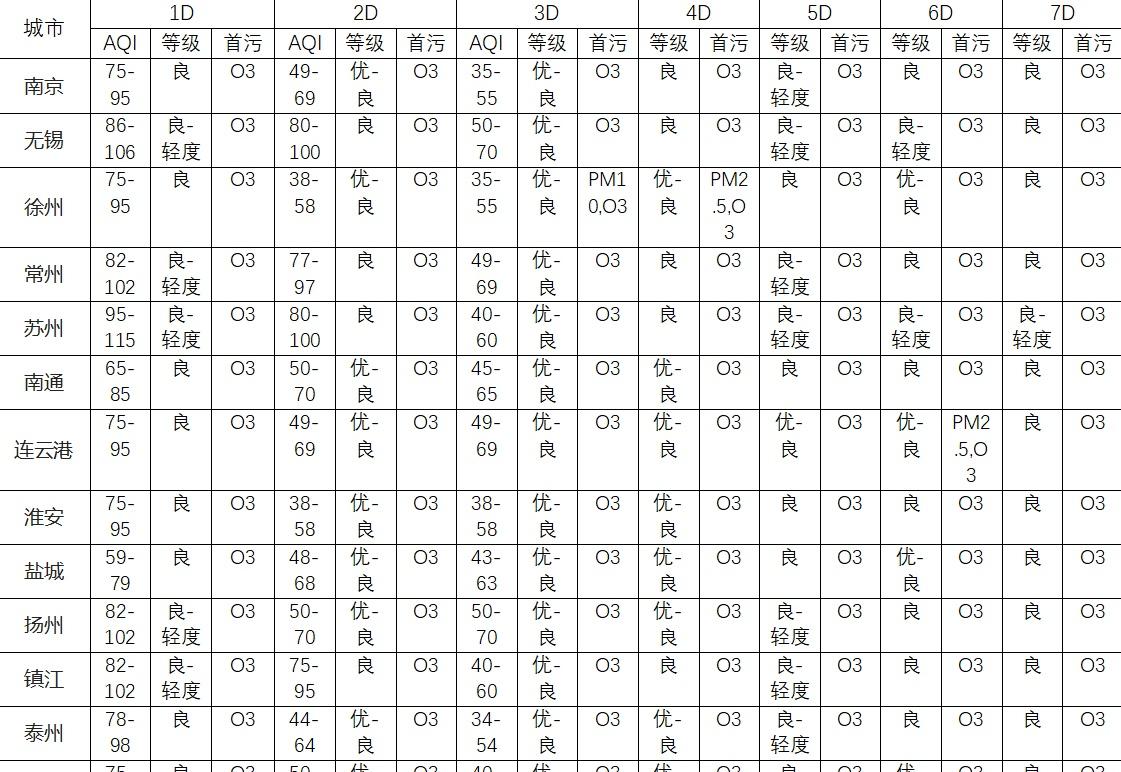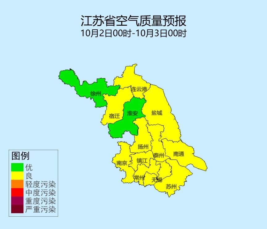 空气质量预报明天全省空气质量以良为主。请关注:10月1-2日受低空切变线及地面江淮气旋影响,全省有一次明显降水过程,2日淮北地区风力较大;8日前后有一次较强冷空气影响江苏。