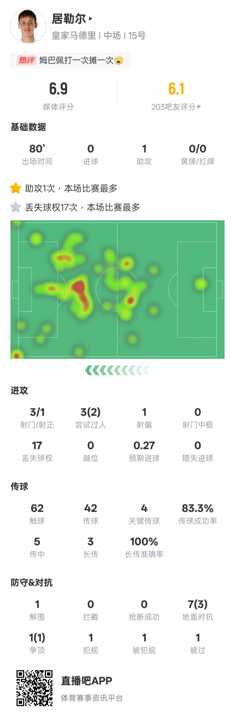 直播吧10月1日讯欧冠联赛阶段第2轮,皇马5-0阿拉木图凯拉特。居勒尔首发出战,送出1次助攻,4次关键传球,但也有全场最多的17次丢失球权,评分6.9。