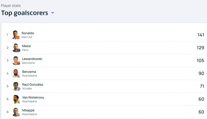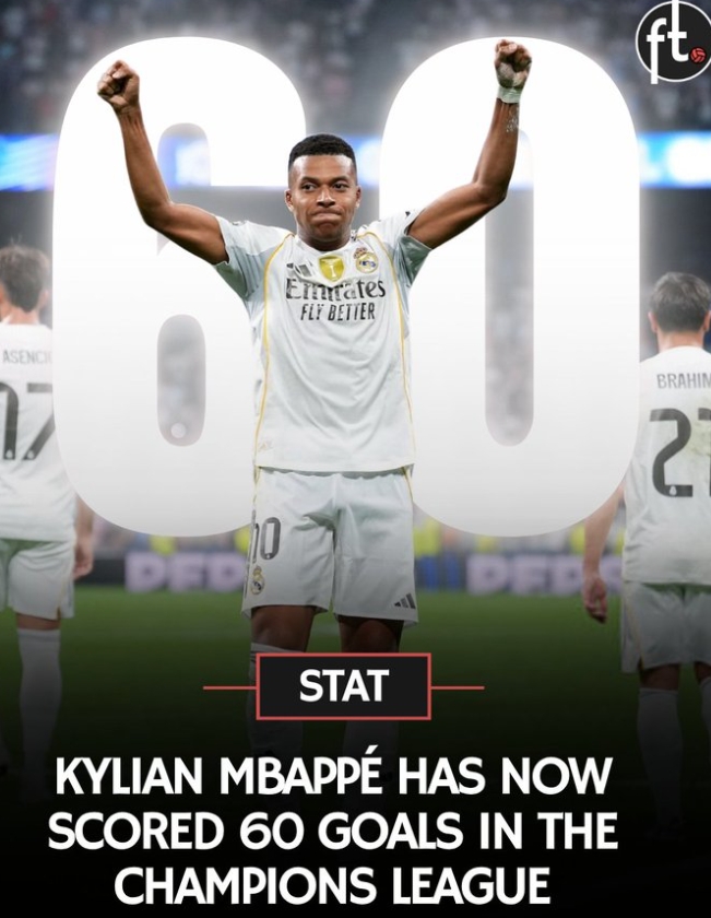 直播吧10月01日讯皇马5-0大胜凯拉特,姆巴佩上演帽子戏法。至此,26岁的姆巴佩在欧冠已经打进60球,位列欧冠历史射手榜第6位。