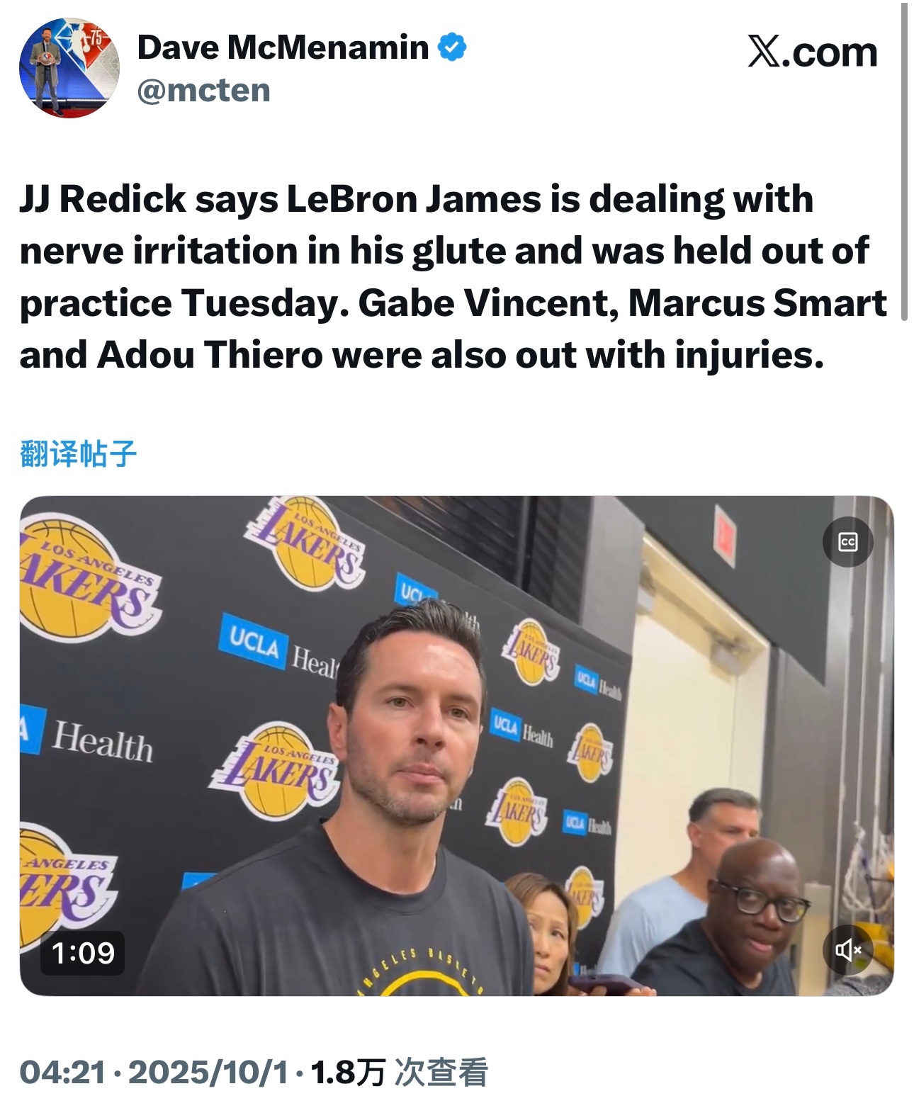 据雷迪克介绍,詹姆斯因为臀部神经问题缺席今天的训练,他身着便装在场边观看队友训练