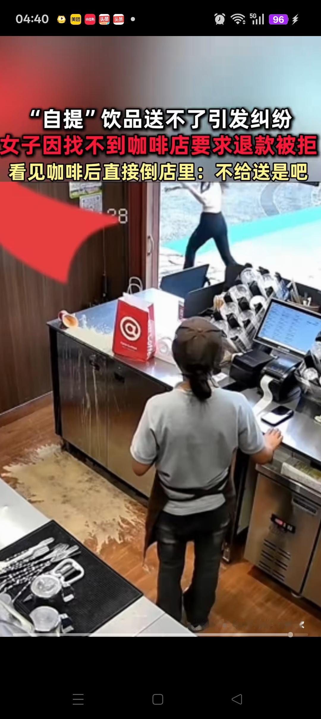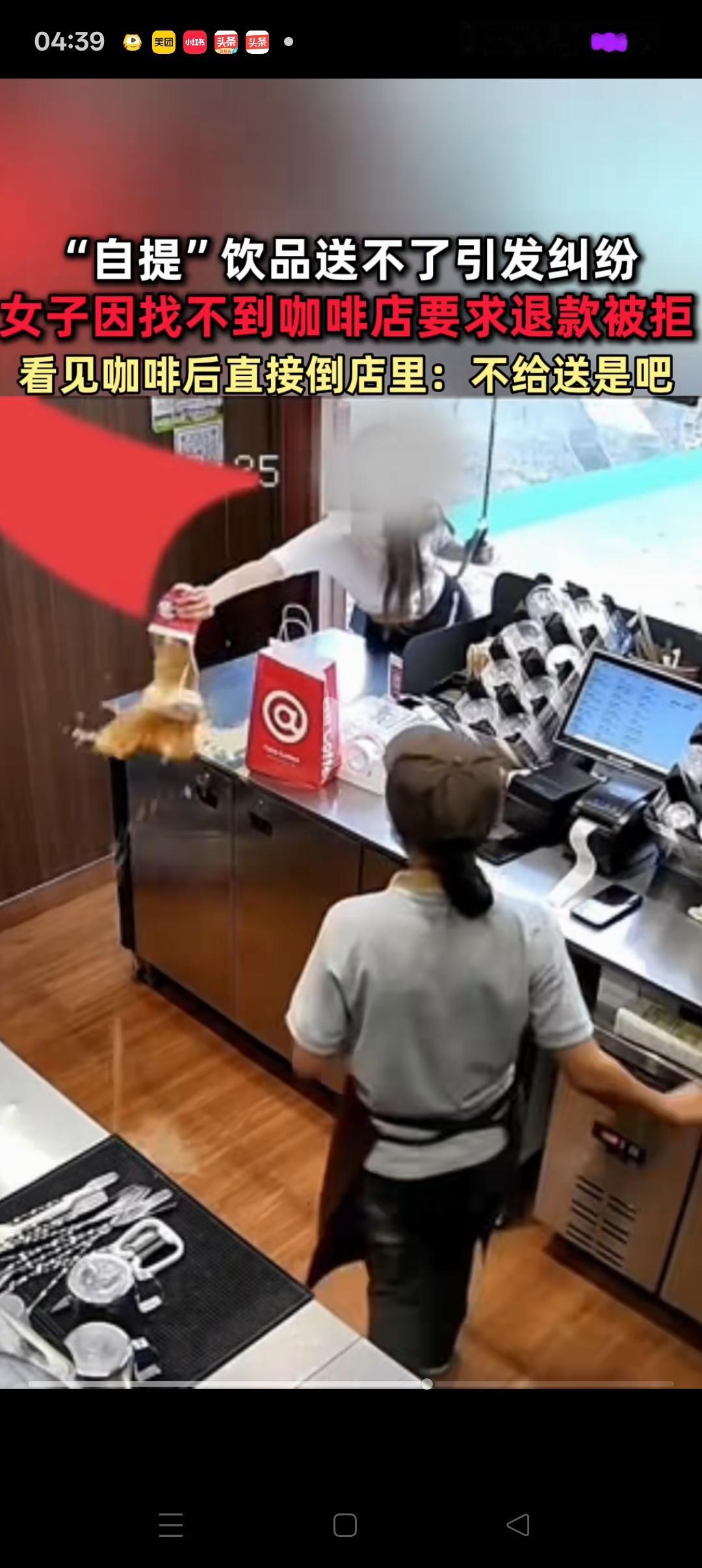 这事我完全站在女的这边,送不了你就别喊自提,再不济也该同意退款。自提咖啡凭什么不送又不退款?